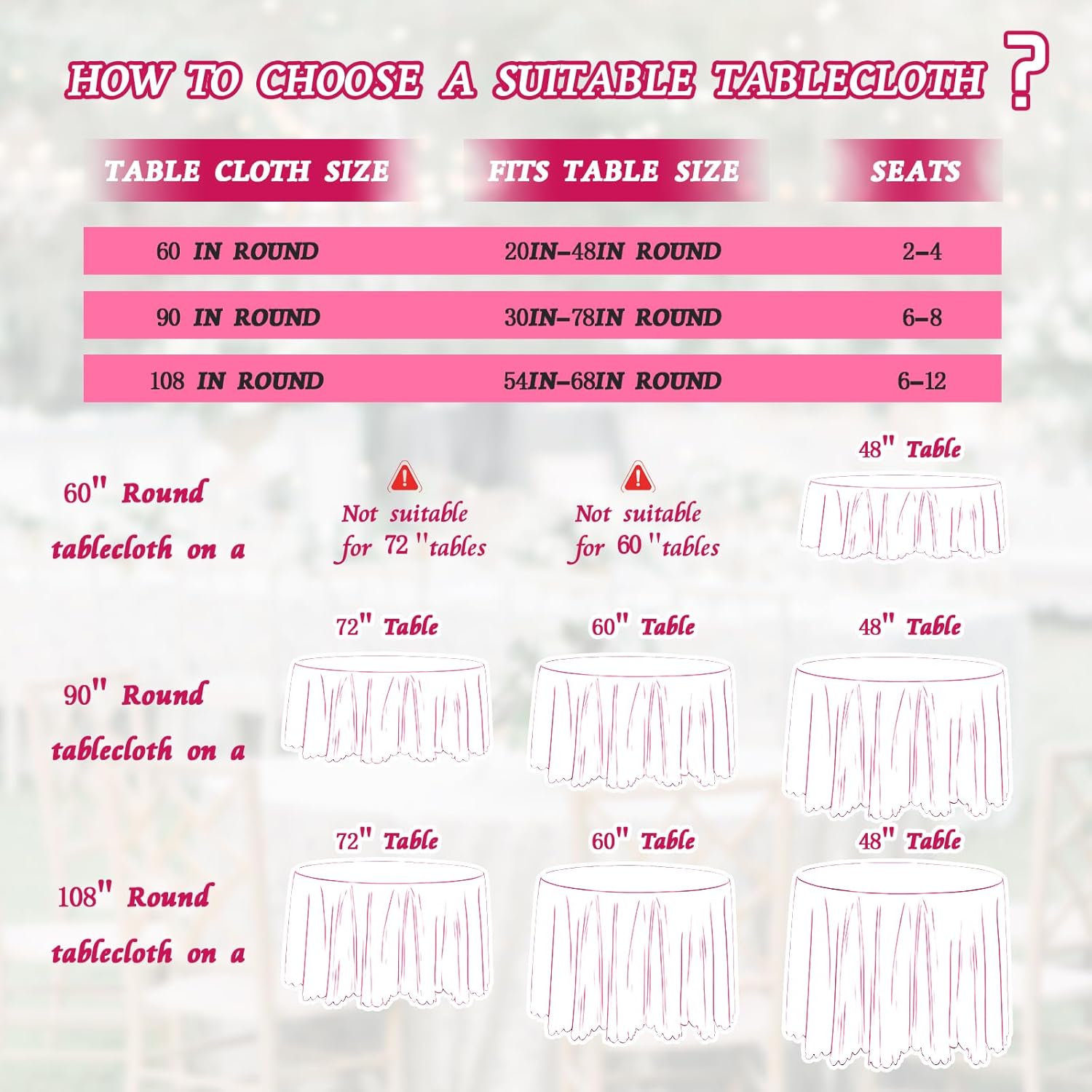 • Widely used scenarios: Round table cloth is suitable for wedding parties, dances, banquet events, birthday parties, restaurant tables, graduation parties, and daily dining tables. It can also be used as decorations for Halloween, Christmas, and Valentine's Day.