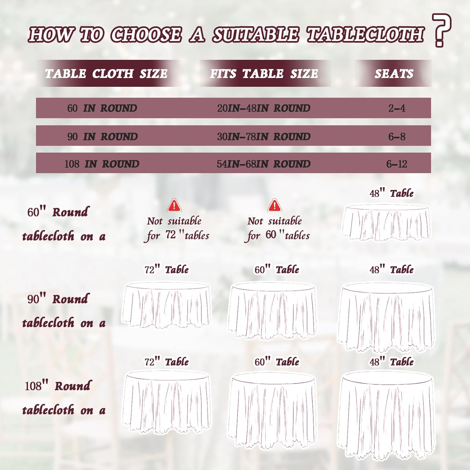 • Widely used scenarios: Round table cloth is suitable for wedding parties, dances, banquet events, birthday parties, restaurant tables, graduation parties, and daily dining tables. It can also be used as decorations for Halloween, Christmas, and Valentine's Day.