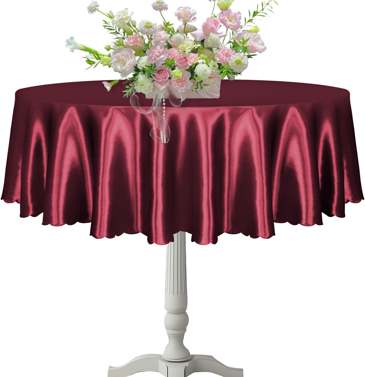 KKJIAF 1 Pack 60 Inch / 5ft Round Table Cloth, Burgundy Overlay Round Satin Table Cover, Silky Satin Dining Tablecloths for Wedding Buffet Parties Banquet Decoration