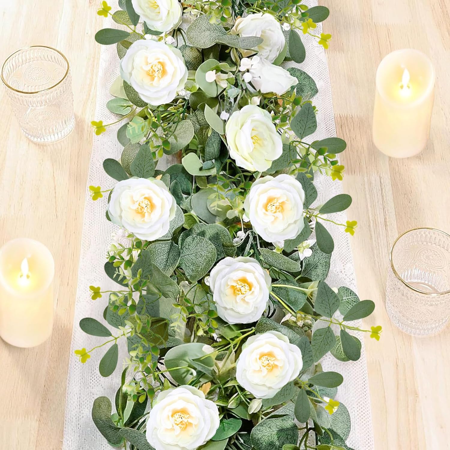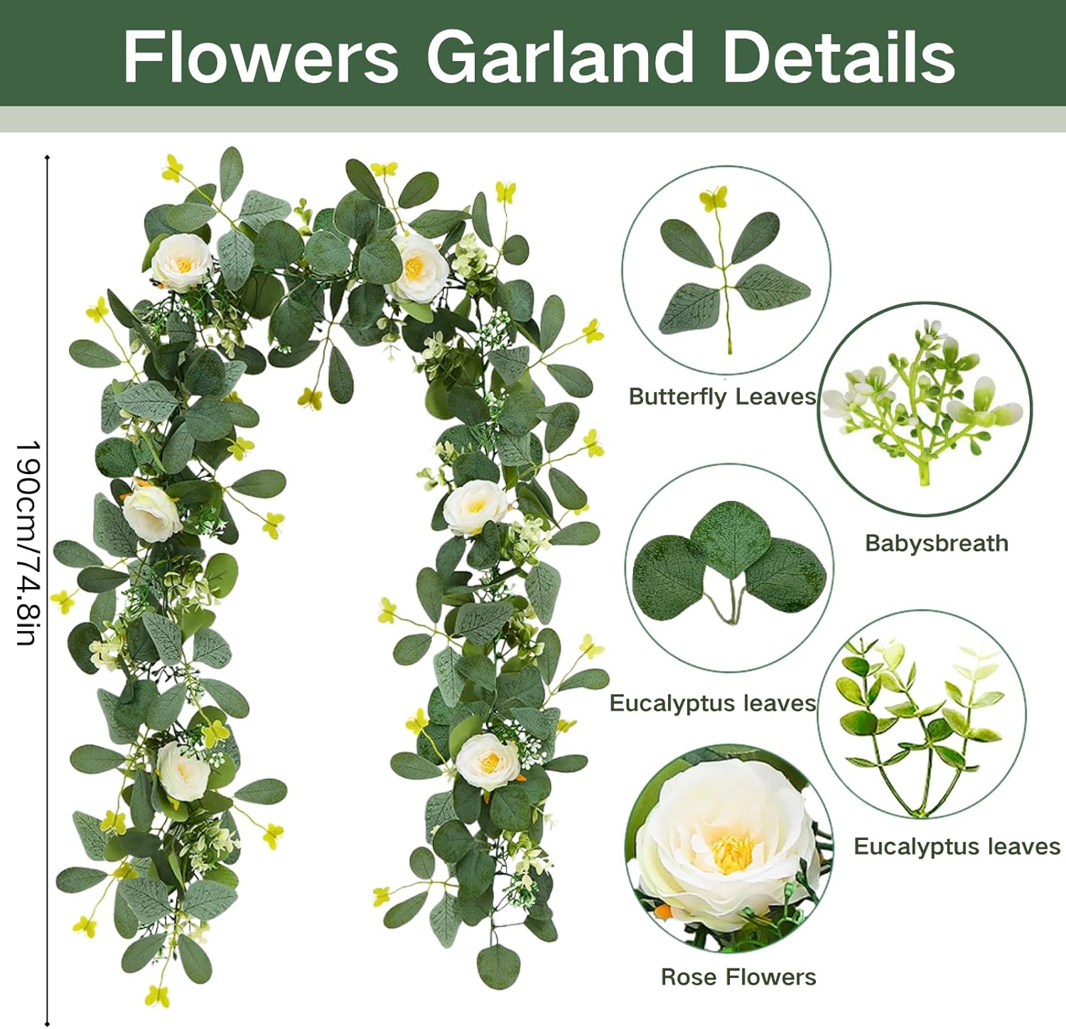 • 【 Spring Garland for Home 】 Package includes 2 packs 6ft eucalyptus garland, One Pack is a roses Garland with 6 rose heads and the other Packs is a common eucalyptus leaf flower vine without roses. the vines perfectly blends realistic and natural rose flowers with eucalyptus leaves. Perfrct for Spring decoration, centerpiece table decorations, table runner, wedding decor and home decor.