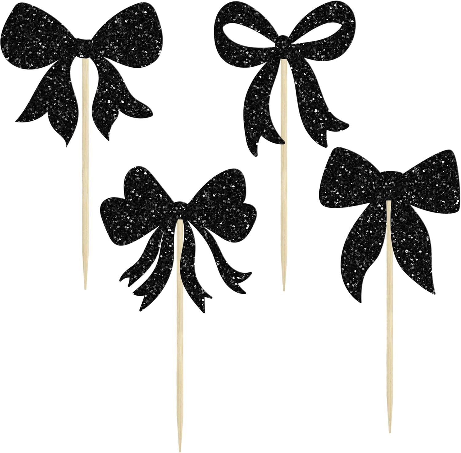 Gyufise 36Pcs Bow Cupcake Toppers Glitter Girls Birthday Decorations Bowknot Cupcake Picks Bow Tie Birthday Decorations Bow Cake Toppers for Bridal Baby Shower Bachelorette Party Supplies Black