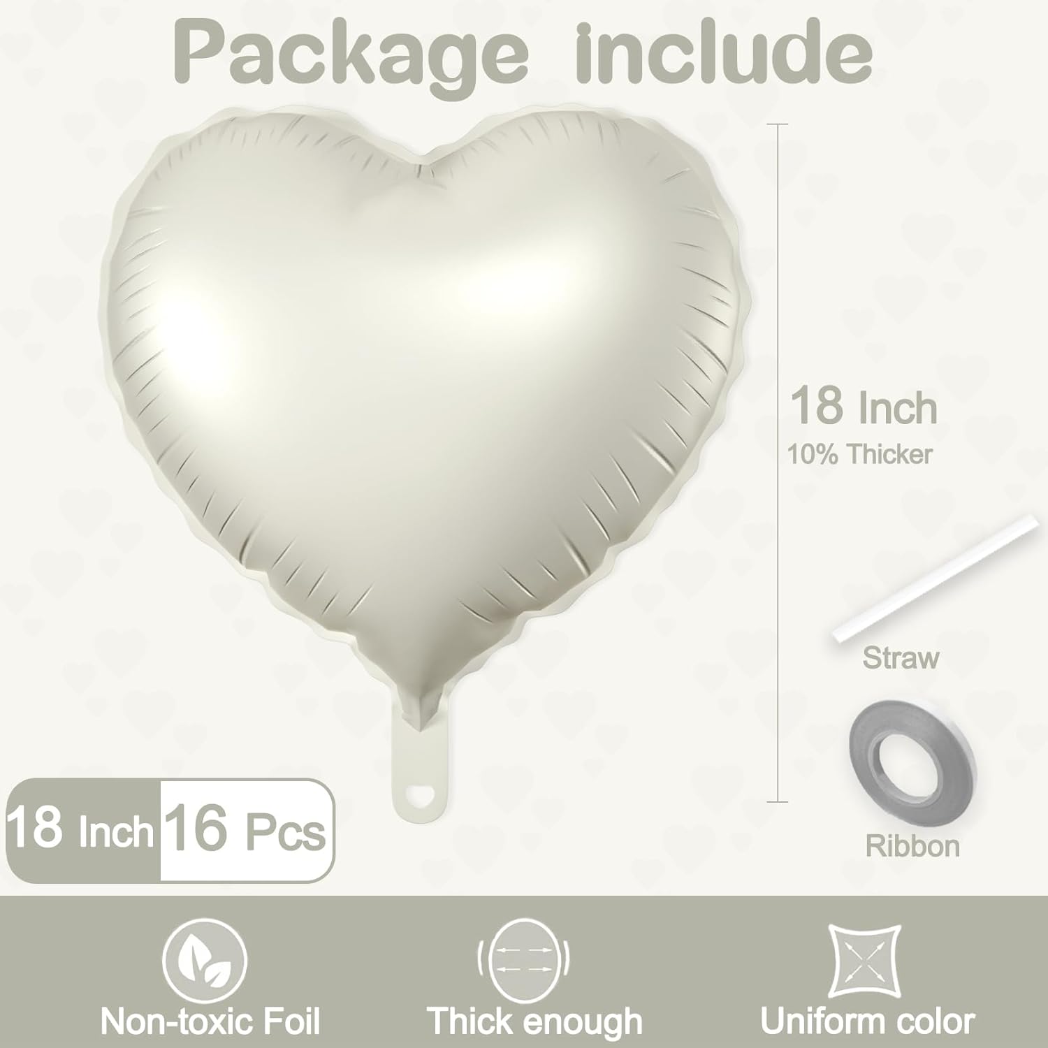 • Package Include: 18 inch heart shaped balloons (16 Pcs White Sand) + straw and ribbon