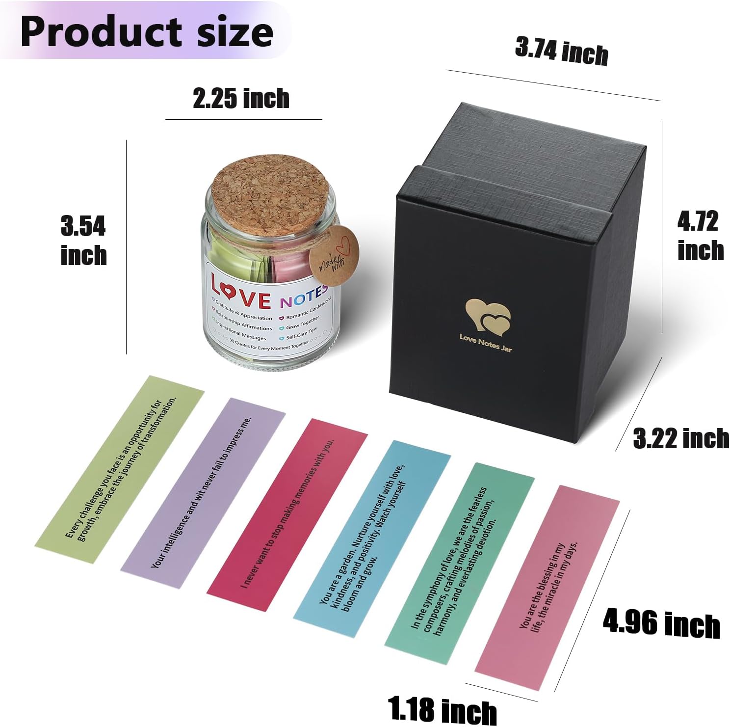 • Romantic Sentiment Reservoir: The "Love Notes" glass jar is a treasure trove of affection. It contains 90 heartwarming sentences in six alluring colors. Each note is a carefully crafted expression of love, perfect for couples to randomly draw and share. Whether it's a lazy Sunday morning in bed, a cozy evening on the couch, or a picnic in the park, this jar adds a touch of romance. It's a unique way to keep the flame of love burning and create beautiful memories