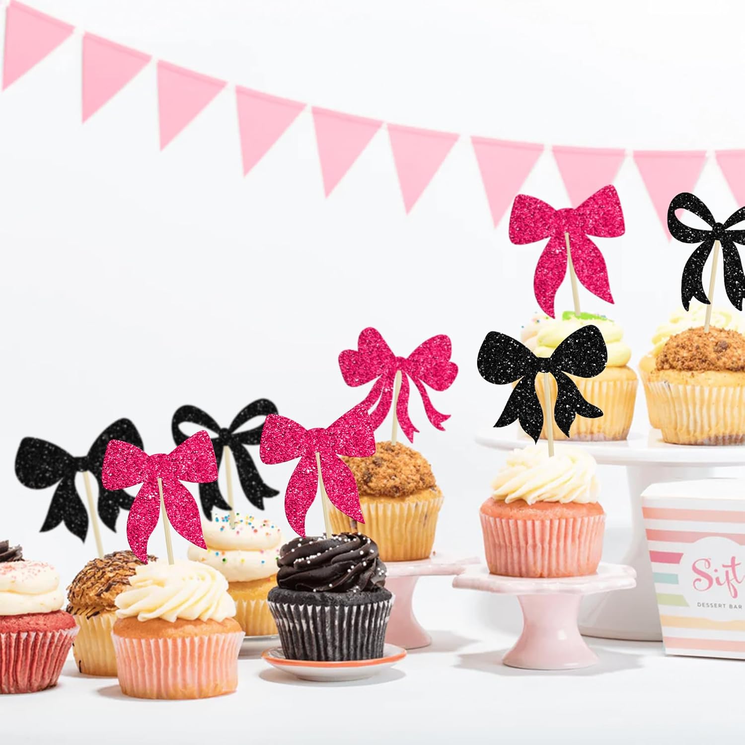 • --Premium Material: These Bow Dots Cupcake Toppers are made of high quality 300 gram glitter card stock and food-grade toothpick, very safe to put them on cakes, cupcakes, ice cream, fruits, pie, dessert, cheese or any dish and food appetizer you want to decorate birthday party decorations.