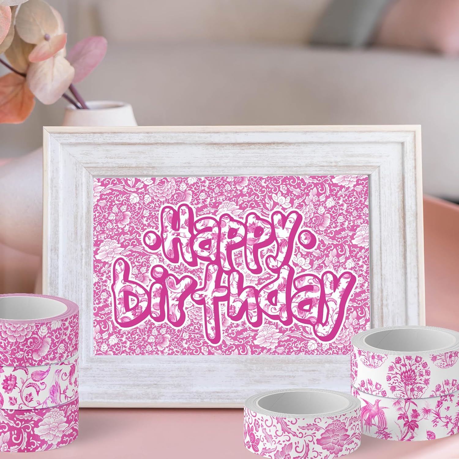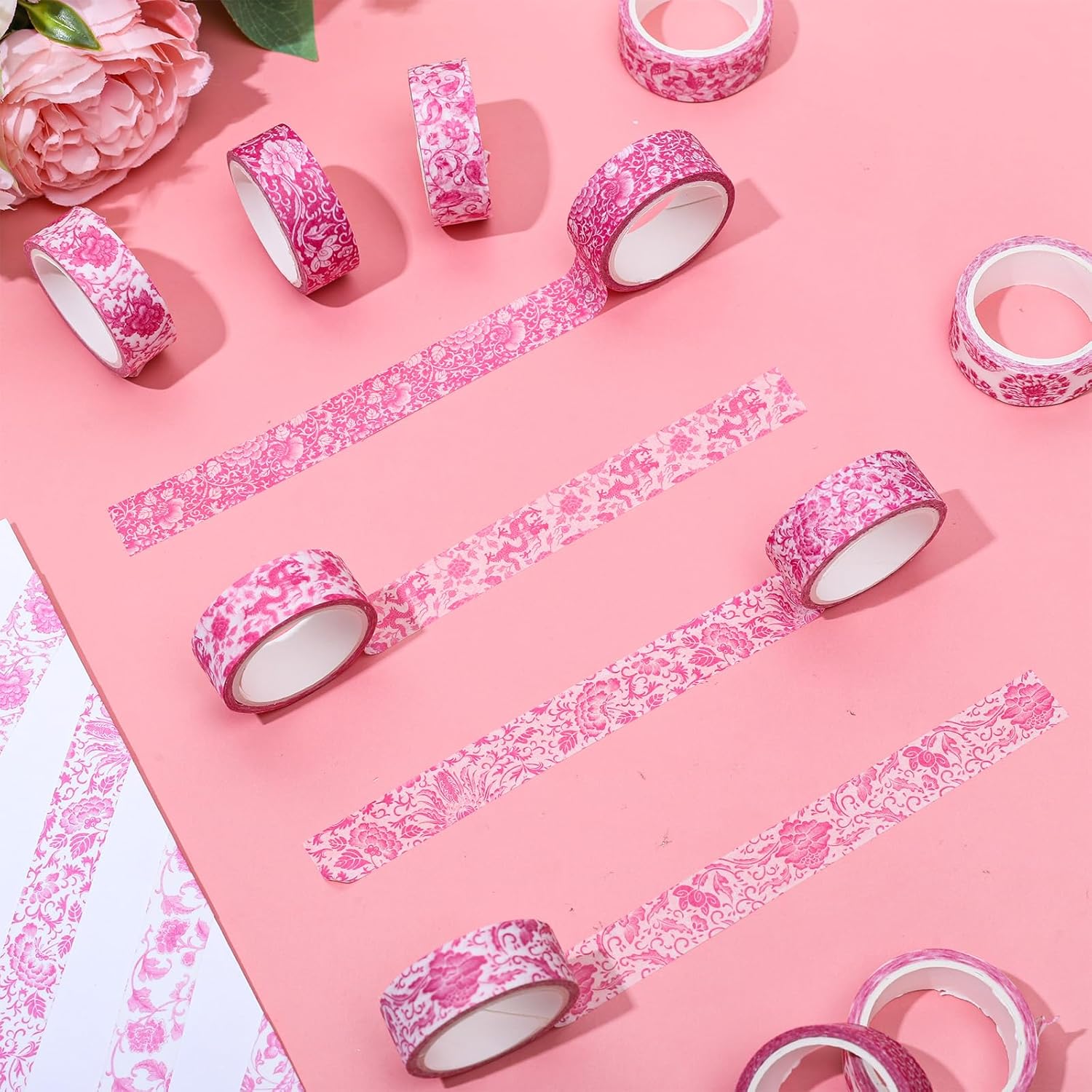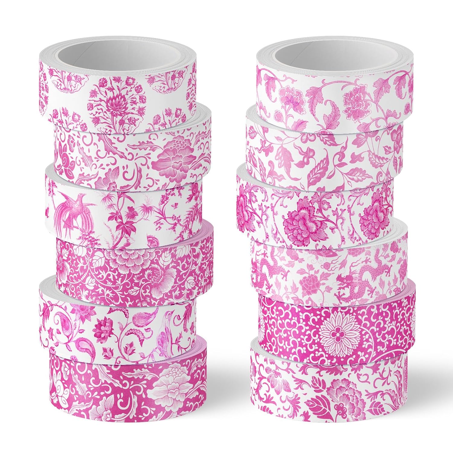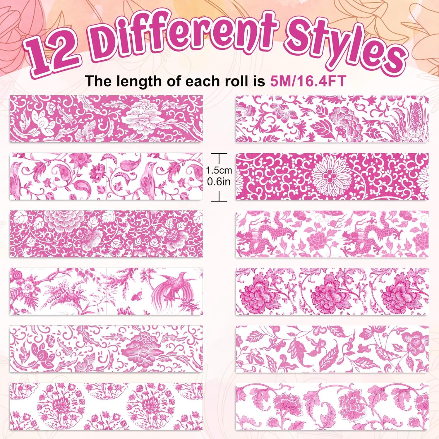 Whaline 12 Rolls Pink Floral Washi Tape Chinoiserie Flower Decorative Masking Tape Set Vintage Wrapping Paper Tape for Scrapbook Journal DIY Art Crafts
