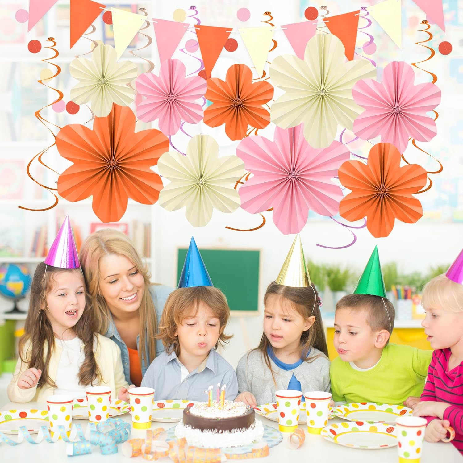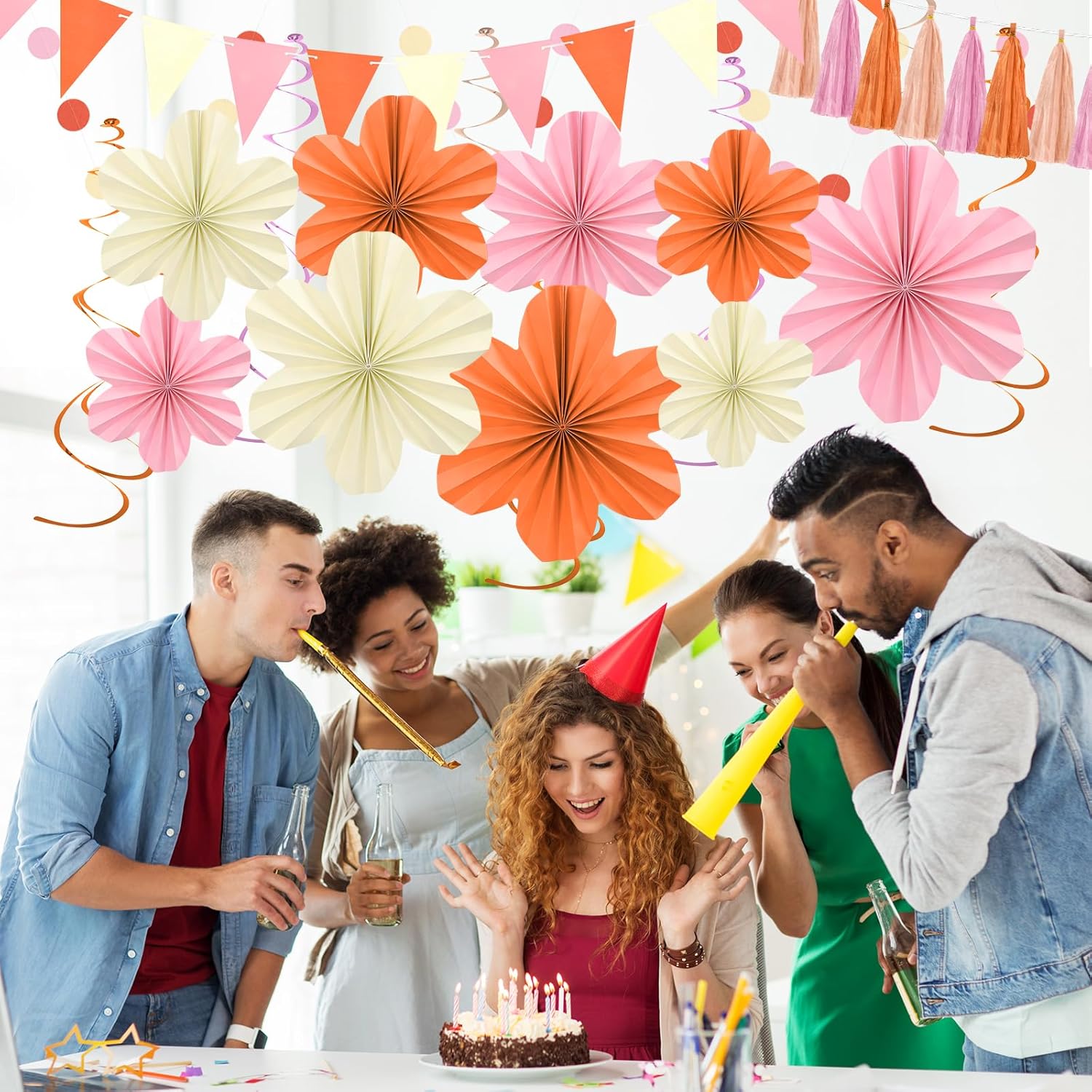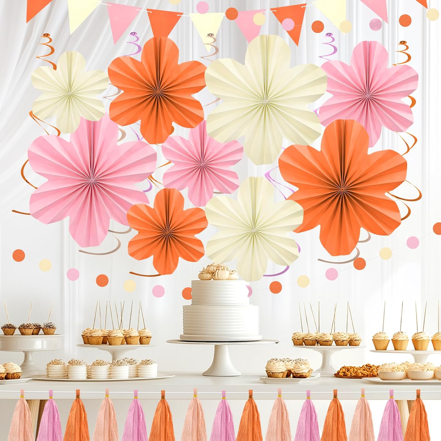 • Orange Party Decorations: Our pink and orange paper fans decorations kit includes 3 pcs 12’’ paper flowers, 3 pcs 10’’ paper flowers, 3 pcs 8’’ paper flowers, 9 pcs hanging swirls, 1 pcs 6.56ft tasseled garland, 1 pcs 6.56ft triangular pennants, 2 pcs circle dot garland, 2 pcs ribbon.