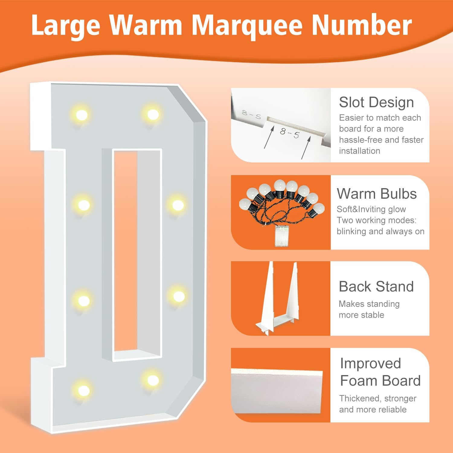 • IMPROVED FOAM BOARDS: Our marquee letters are made from high-density thickened foam boards, the slots and connectors can be tightly linked togethe for better stability. Each letter has a sturdy back stand to ensure that your party marquee sign will not tip over. (Tips: When outdoors, please place something heavy on the back stand to prevent the letter sign from blowing over).
