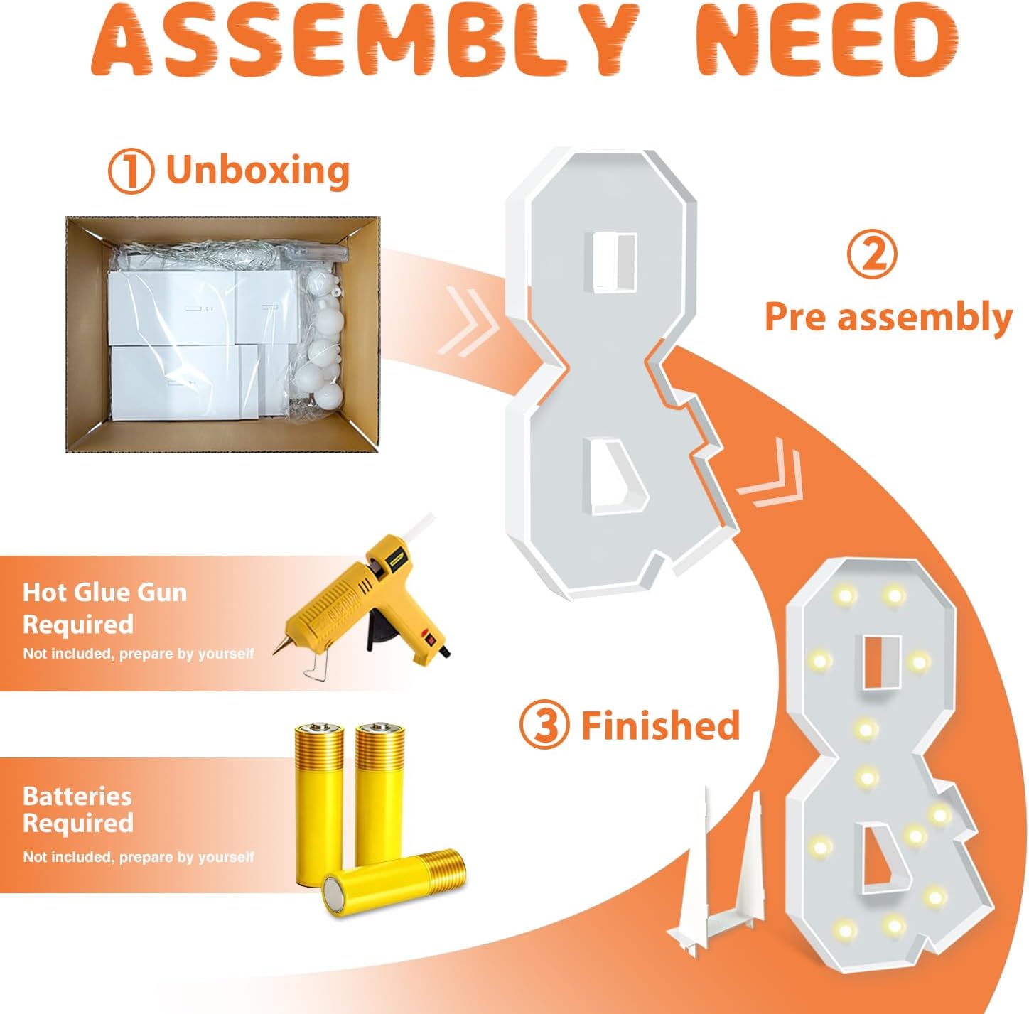 • EASY TO ASSEMBLE: The package includes pre-cut foam boards, light strings and instructions. Each foam board has slots and is numbered, so you can match them according to the 2 same numbers. All you need to do is to prepare a hot glue gun and 3 AA batteries, follow the step-by-step instructions or online video for a hassle-free assembly. Decorate the party with your kids or friends and enjoy the DIY fun. (Note: Glue gun, glue and batteries are not included)