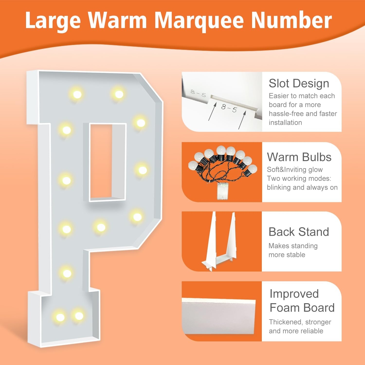 • IMPROVED FOAM BOARDS: Our marquee letters are made from high-density thickened foam boards, the slots and connectors can be tightly linked togethe for better stability. Each letter has a sturdy back stand to ensure that your party marquee sign will not tip over. (Tips: When outdoors, please place something heavy on the back stand to prevent the letter sign from blowing over).