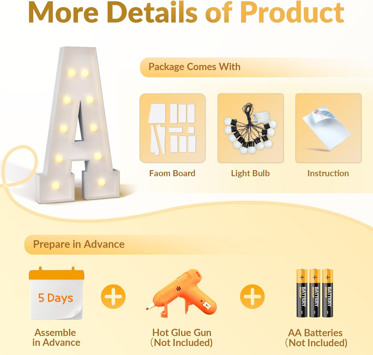 • Warm Yellow Lights: Our big letters with lights feature warm yellow string lights that emit a gentle glow, enriching the ambiance of the space and making them a favorite choice for party settings