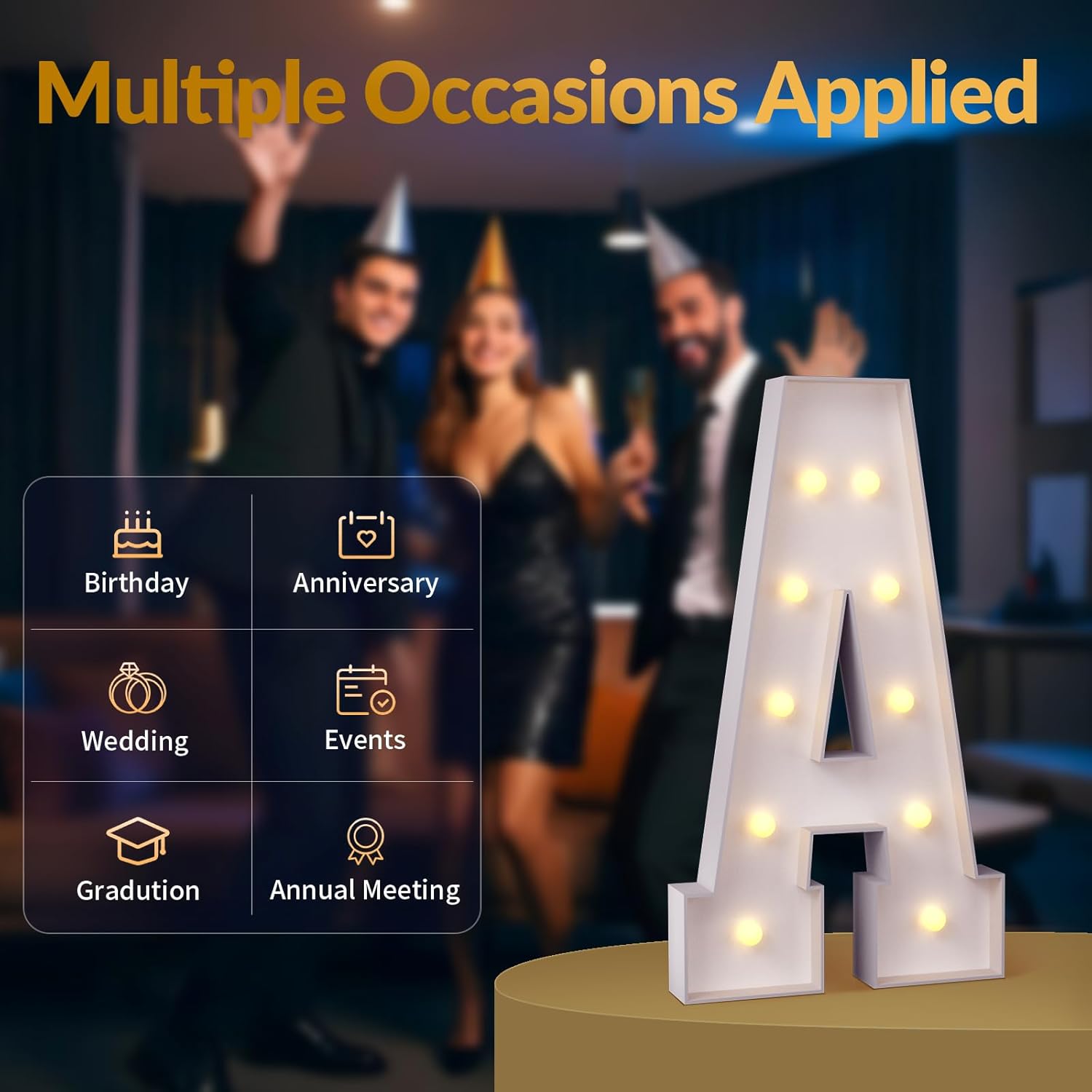 • Warm Yellow Lights: Our big letters with lights feature warm yellow string lights that emit a gentle glow, enriching the ambiance of the space and making them a favorite choice for party settings