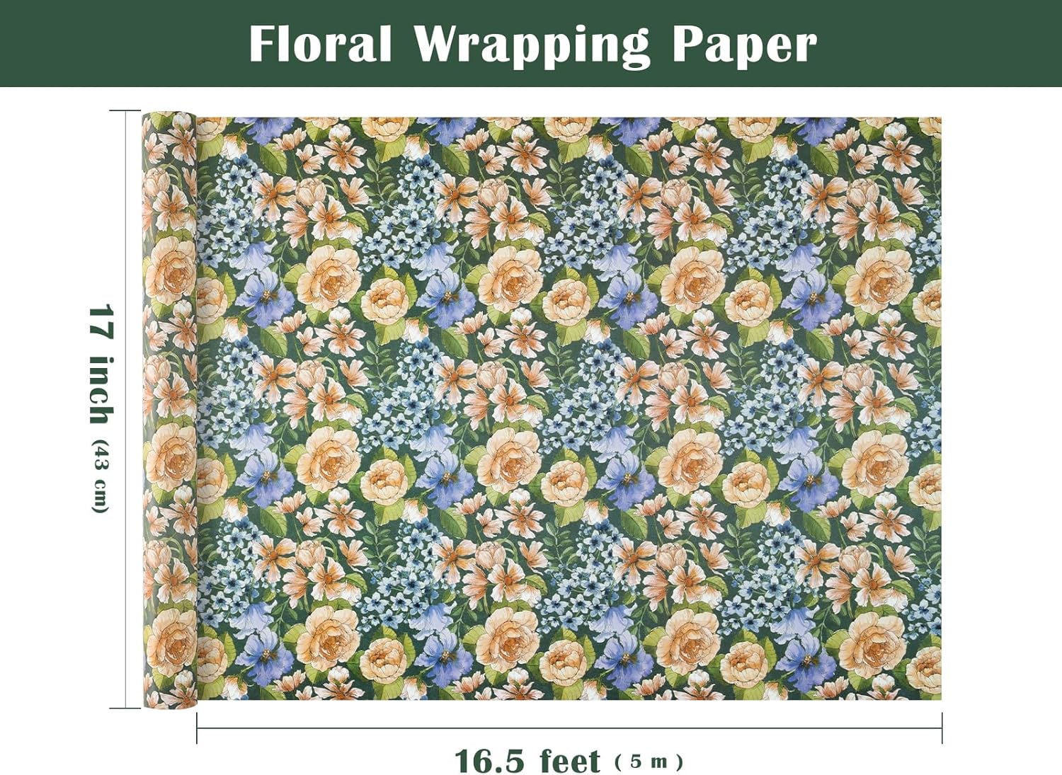 WRAPAHOLIC Kraft Floral Wrapping Paper Roll - Mini Roll - 17 Inch x 16.5 Feet - Vintage Flower Wrapping Paper Perfect for Wedding, Birthday, Bridal Shower, Tea Party