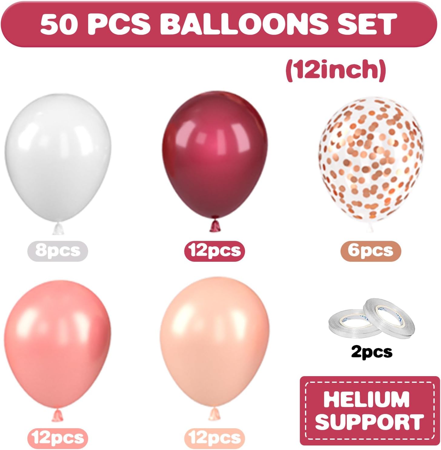 • 50 Pcs Burgundy Balloons: Add a pop of charm to your party with this gorgeous set of 50 burgundy and gold balloons, including 12* pearl rose gold balloons, 12* pearl champagne gold balloons, 12* burgundy balloons, 8* white balloons, 6* rose gold confetti balloons, 2* white ribbons. These burgundy balloons will make your party venue look stunning and create the wonderful backdrop for unforgettable moments.