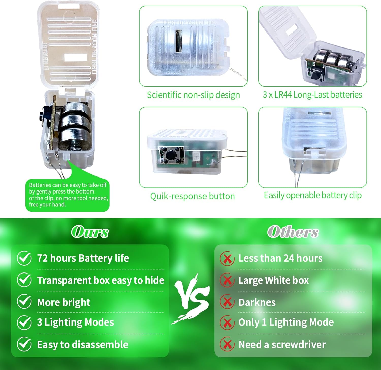 • IP65 WATERPROOF AND INDIVIDUALLY WRAP: The battery fairy lights are waterproof can be used for Indoor/Outdoor. (the battery pack is not waterproof) safe to the touch. Made of soft bendable wire so you can easily bend into any shape or wrapped it on anything such as Christmas trees, wine bottle, pumpkins, guirlande lumineuse interieure, potted landscape etc.Each light is individually packaged, say goodbye to cable tangles and bring more happiness and satisfaction to your family and friends