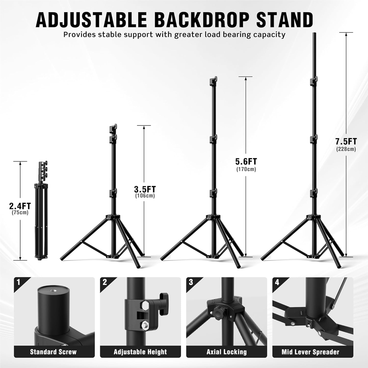 • ๐—”๐—ฑ๐—ท๐˜‚๐˜€๐˜๐—ฎ๐—ฏ๐—น๐—ฒ ๐—ฆ๐—ถ๐˜‡๐—ฒ ๐—ณ๐—ผ๐—ฟ ๐—ฉ๐—ฒ๐—ฟ๐˜€๐—ฎ๐˜๐—ถ๐—น๐—ฒ ๐—จ๐˜€๐—ฒ: This backdrop stand kit offers a height range of 2.4ft to 7.5ft and width options of 5.9ft, 7.9ft, and 10ft, giving you full flexibility for various event setups such as photo booths, weddings, baby showers, and studio work.
