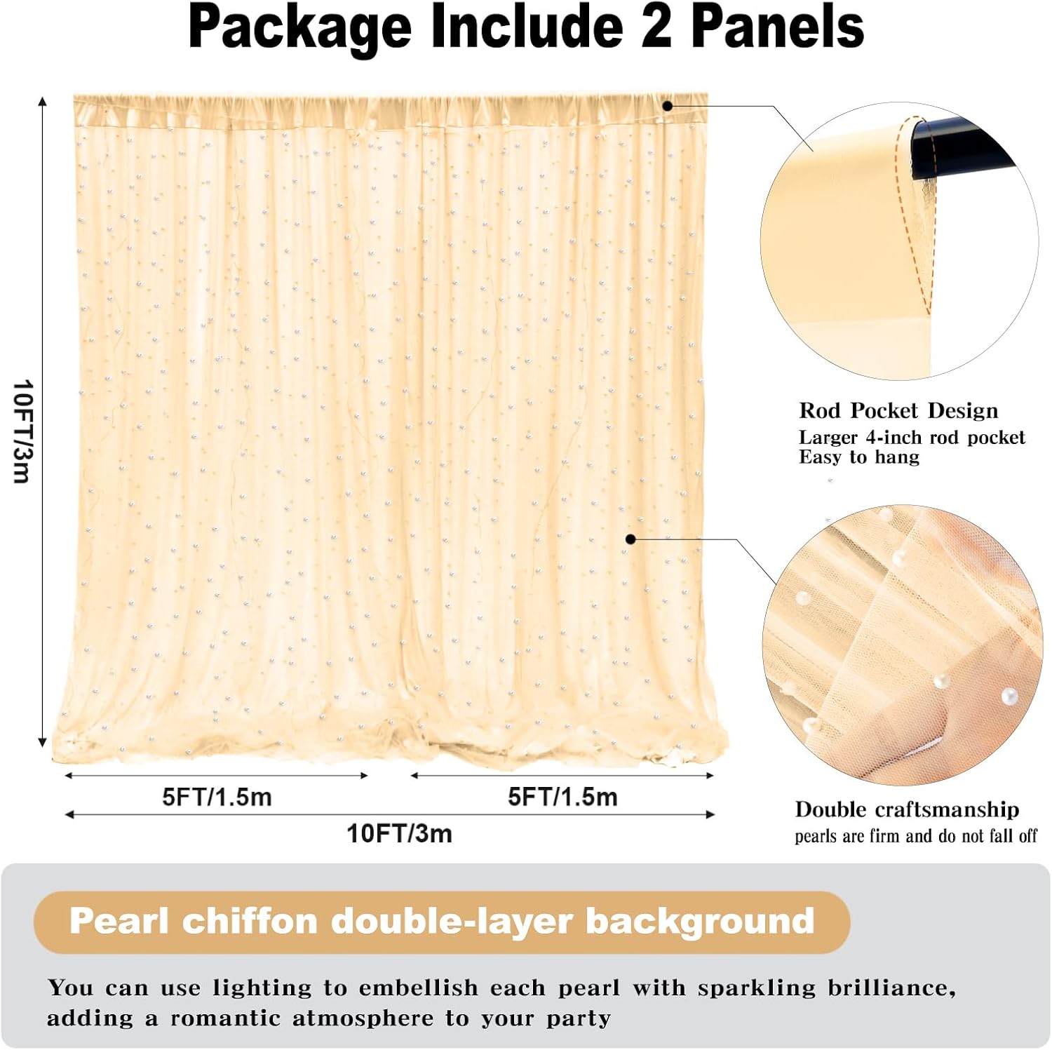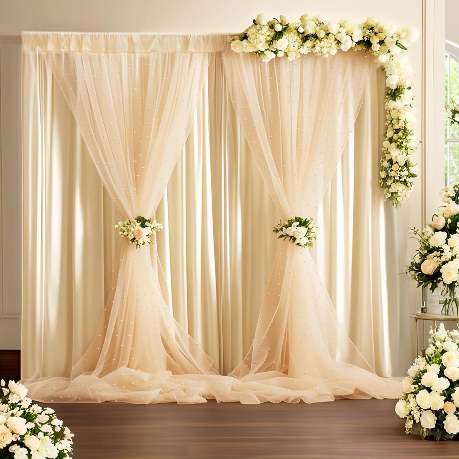 • Material: This is a set of double-layered backdrop curtains, which are composed of two layers: pearl tulle and beige lining. The pearl tulle exudes romance and beauty, while the white lining is designed to be opaque.