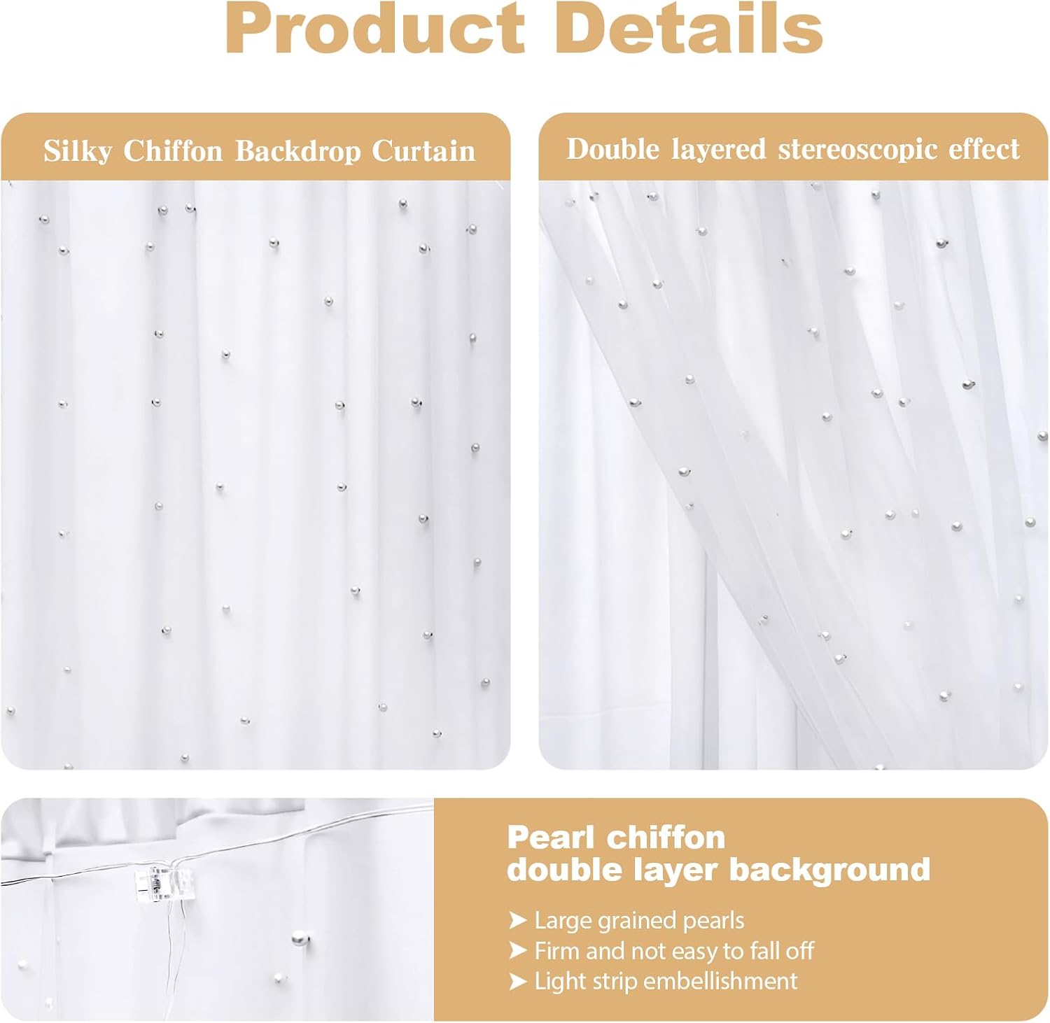 • Material: This is a set of double-layered backdrop curtains, which are composed of two layers: pearl tulle and white lining. The pearl tulle exudes romance and beauty, while the white lining is designed to be opaque.