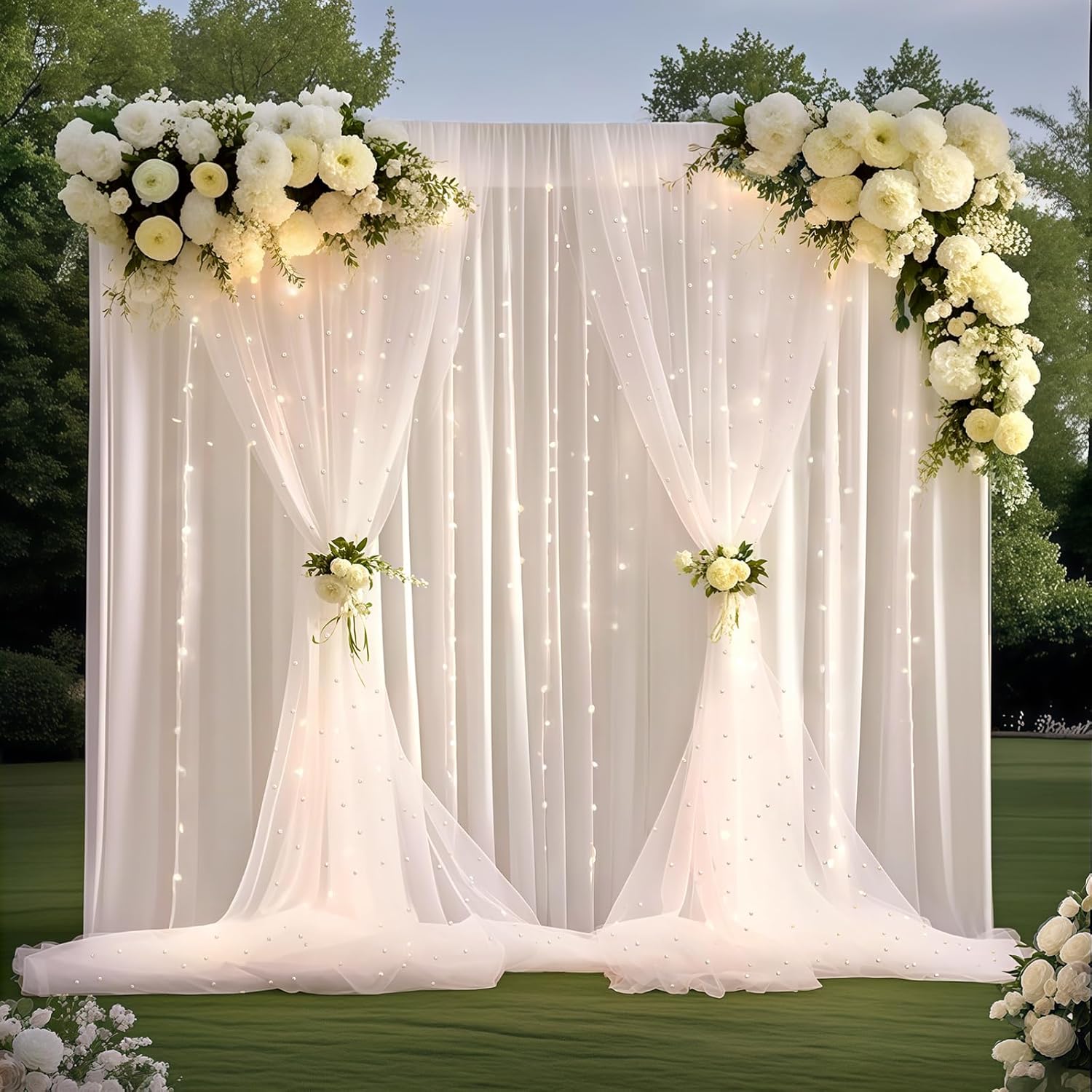 • Includes: 2 panels of 5*8 FT wrinkle-free white pearl sheer tulle backdrop curtain, a set of 10-foot warm-colored string lights, and 12 clear clips.
