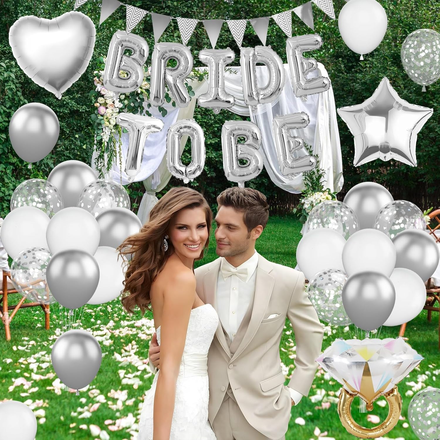 Silver Bachelorette Party Decorations, Silver Bride To Be Bridal Shower Balloons Decorations, Metallic White Balloon with Diamond Ring Star Heart Balloon for Bachelorette Engagement Wedding