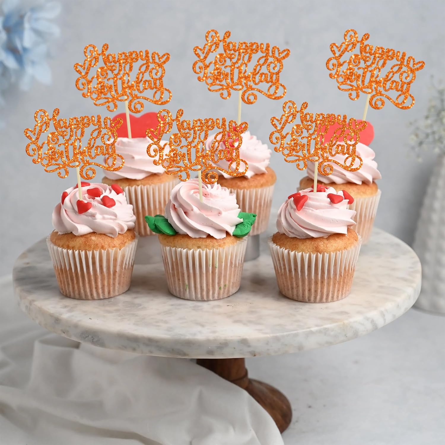 Gyufise 24Pcs Happy Birthday Cupcake Toppers Glitter Happy Birthday Cupcake Picks for Celebrating Happy Birthday Anniversary Theme Party Cake Decorations Supplies Orange