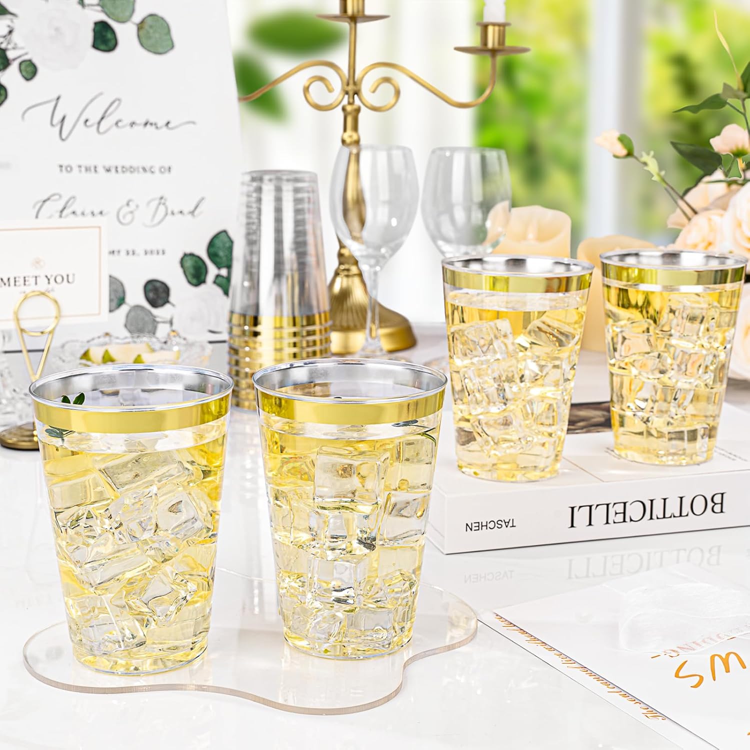 BESTVIP 12oz Gold Plastic Cups, 100 Pack Gold Rimmed Disposable Cups, Heavy-duty Party Cocktail Glasses, Plastic Cups for Party, Holiday, Christmas, Thanksgiving, Wedding and Birthday