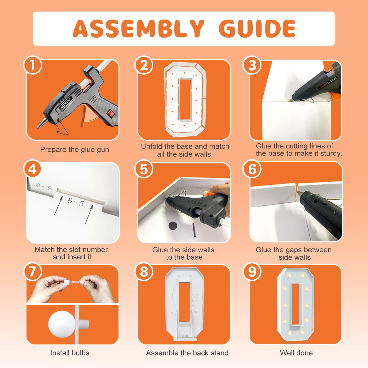• EASY TO ASSEMBLE: The package includes pre-cut foam boards, light strings and instructions. Each foam board has slots and is numbered, so you can match them according to the 2 same numbers. All you need to do is to prepare a hot glue gun and 3 AA batteries, follow the step-by-step instructions or online video for a hassle-free assembly. Decorate the party with your kids or friends and enjoy the DIY fun. (Note: Glue gun, glue and batteries are not included)