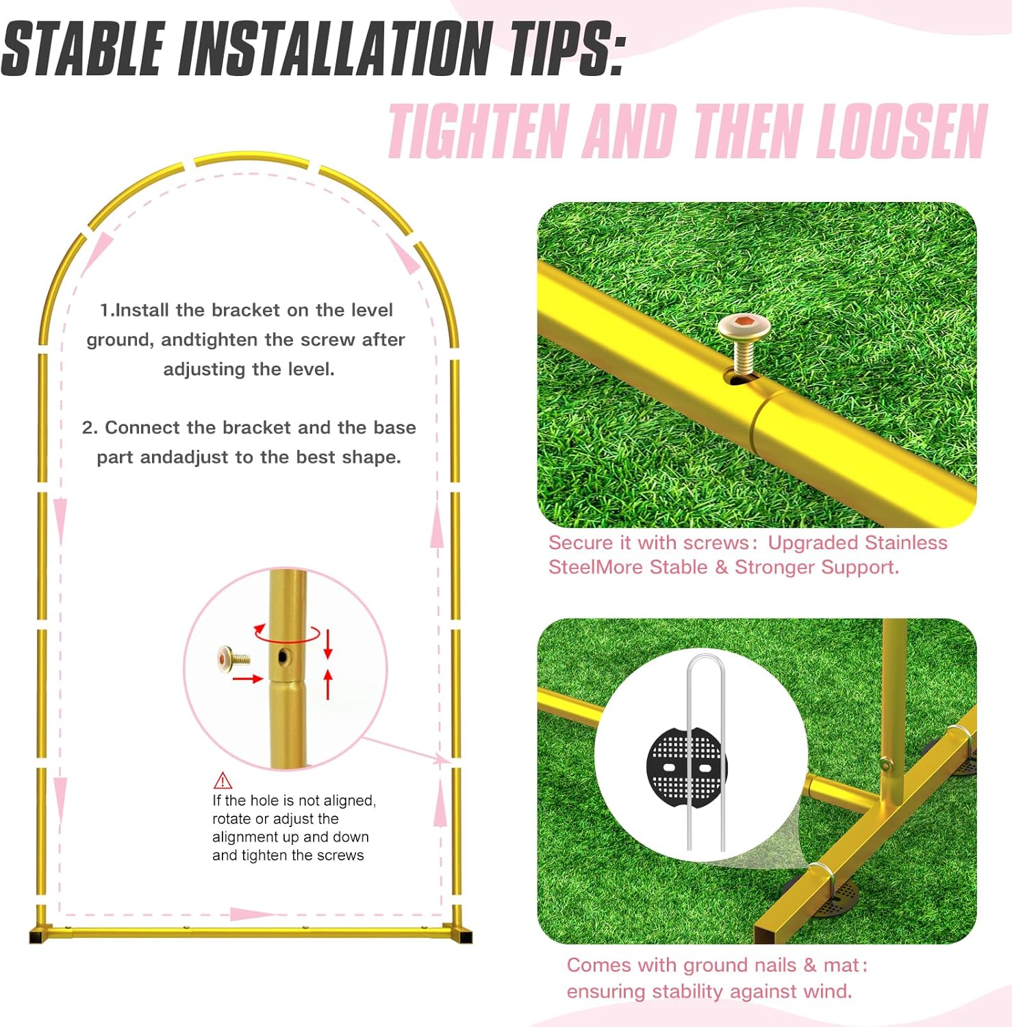 • 【Versatile Metal Arch Kit】: Set of 3 gold metal arch stands (7.2FT/6.6FT/6FT), 4 transparent balloon boxes, 12 arc floor nails, 12 floor mats and 3 storage bags. Ideal for both indoor and garden outdoor celebration decoration ,providing the perfect size for any event.Metal arches frame create a richly layered dynamic background for you