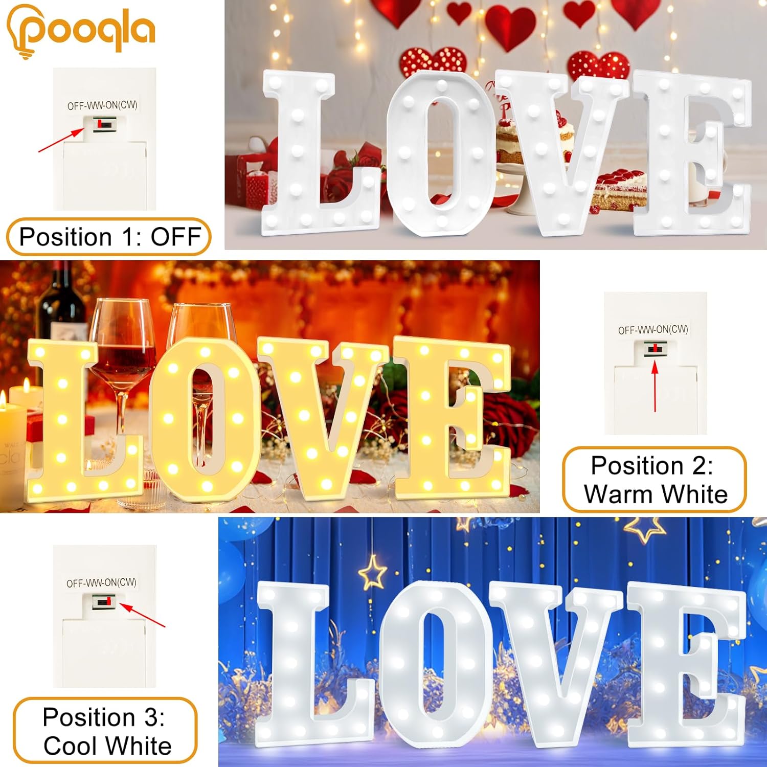 • 2 Optional Colors: Each LED letter has two colors for you to choose, respectively, warm white and cold white. There is a switch behind the letters, and you just need to adjust the switch left and right to choose the color you want
