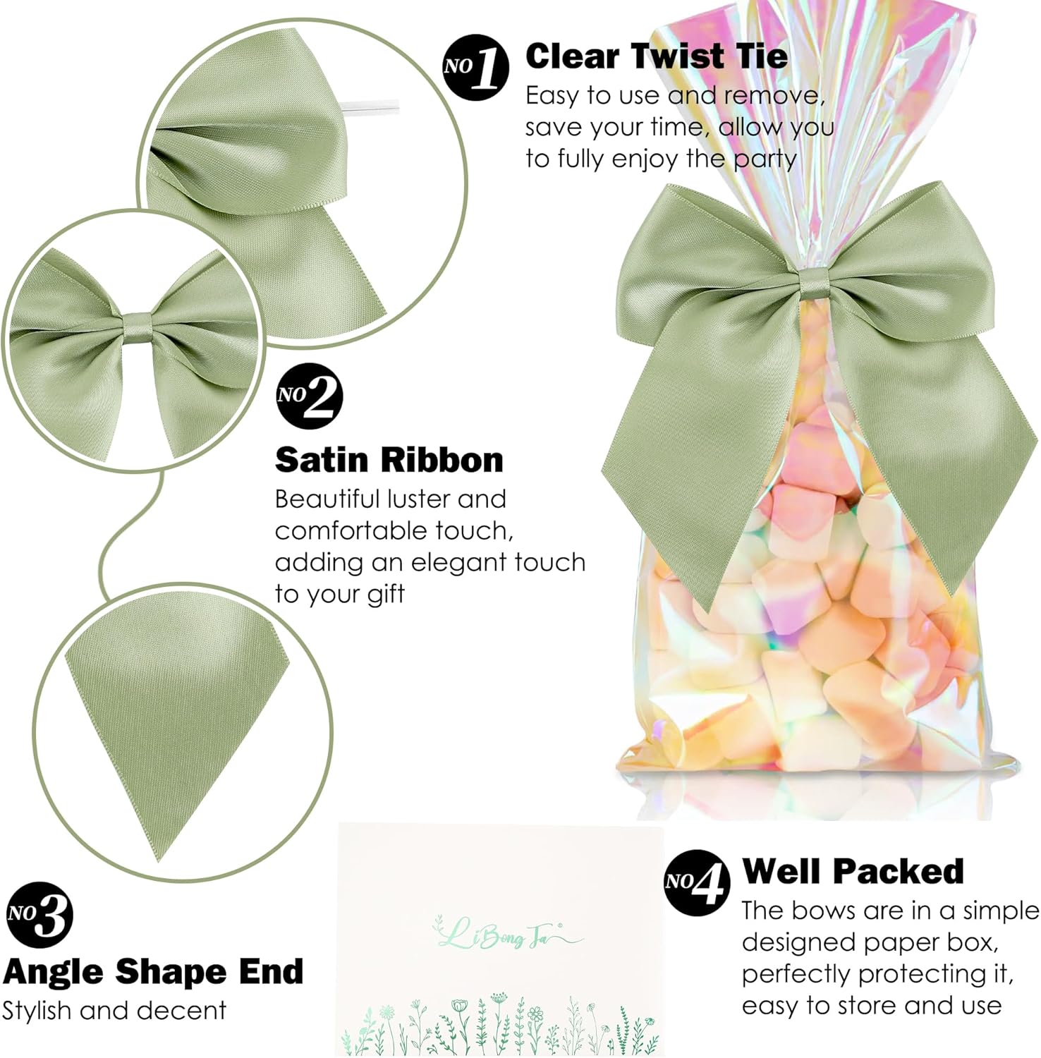5'' Sage Green Bow Party Decorations Satin Bows, Twist Tie Bows for Treat Bags, Cake Pops, Pre-tied Bow Premade Ribbon Bows for Crafts, Holiday Bows for Gift Wrapping, Wedding Decor-24 Counts