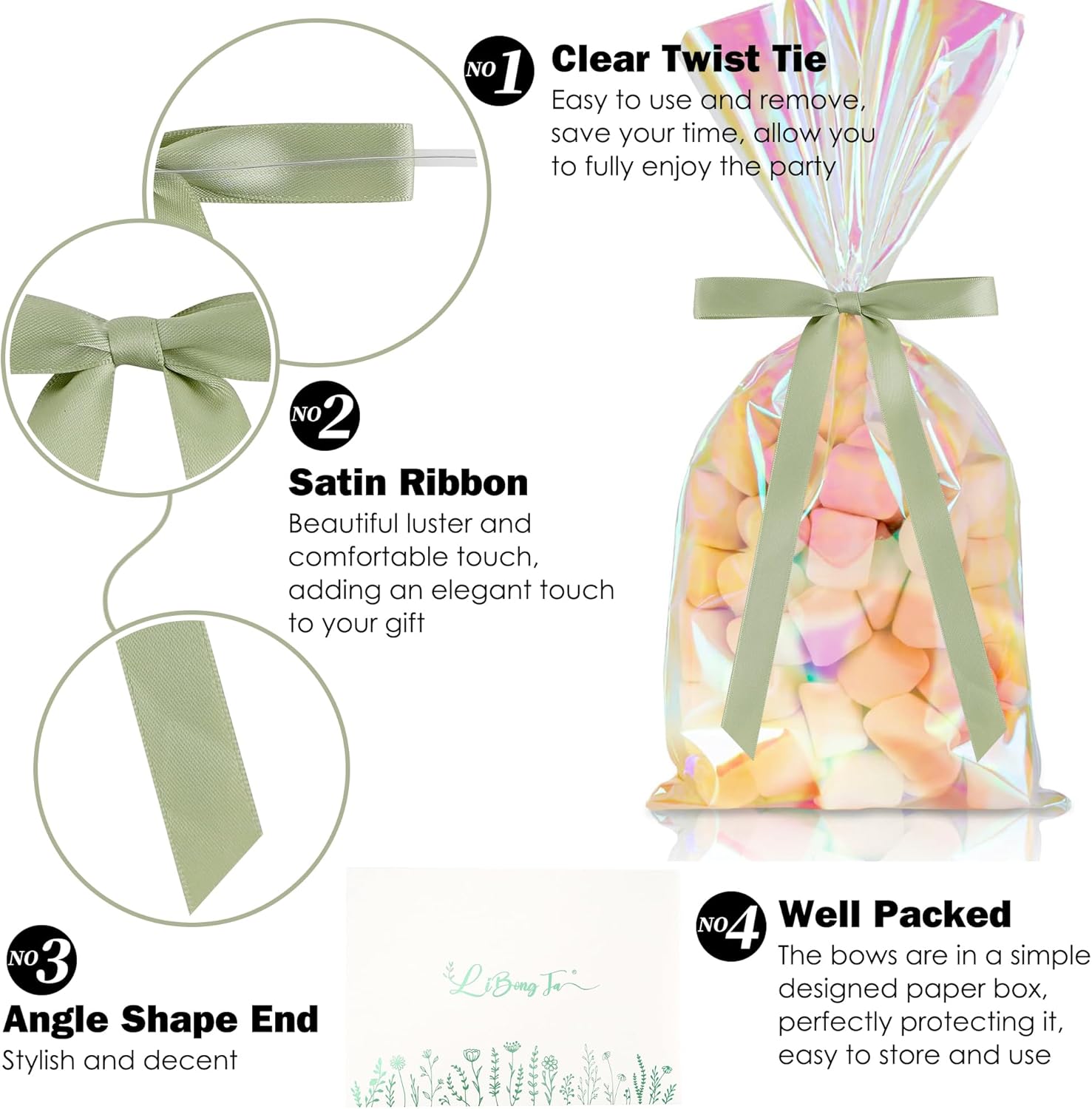 50 PCs Sage Green Bow 5 Inch Long Tail Bows for Gift Wrapping, Wedding Bow Party Decorations, Twist Tie Bows, Satin Bows for Crafts, Premade Bows for Presents, Treat Bags, Bottles, Cakes