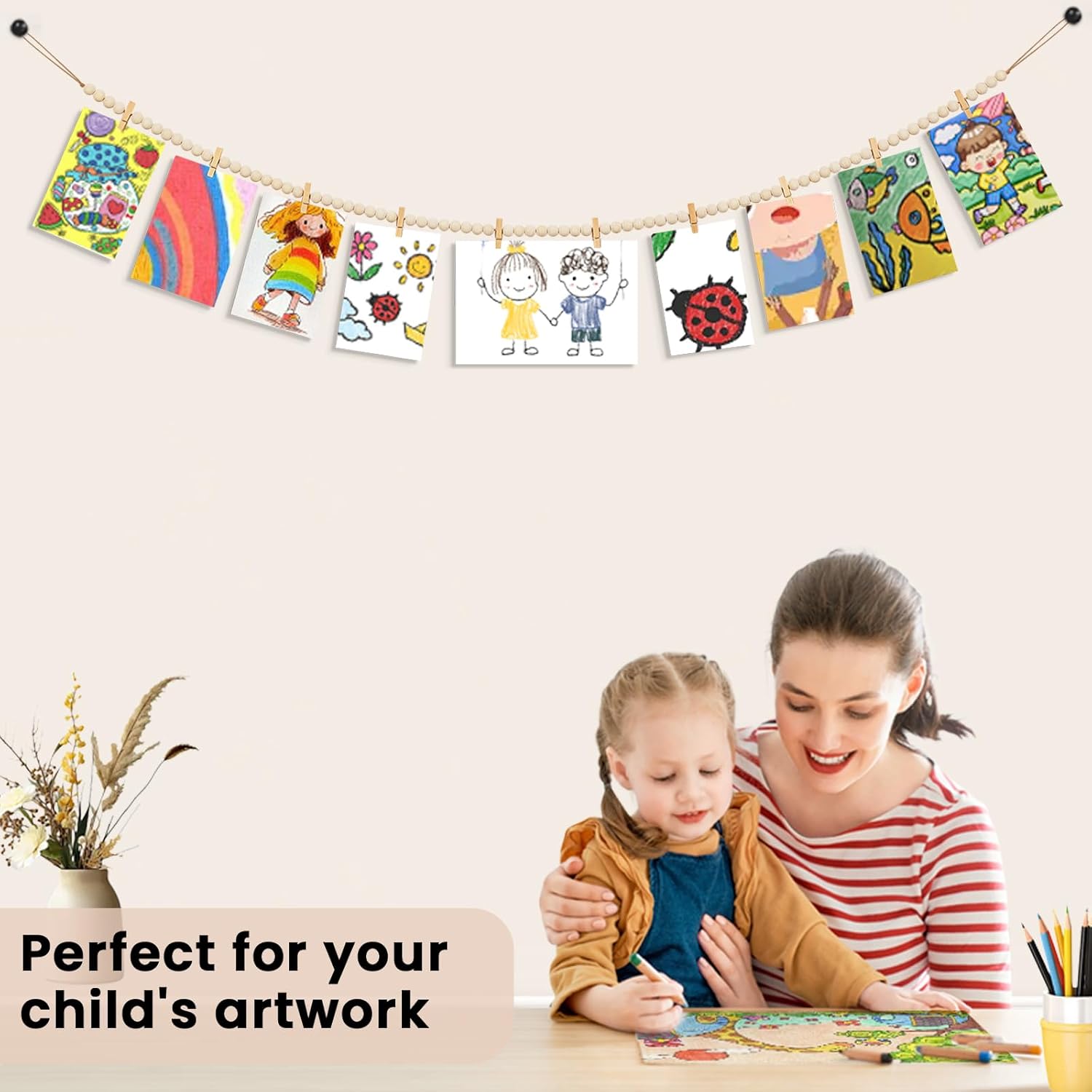 • This hanging photo display is hand-made with natural wooden beads and jute rope, durable, corrosion-resistant and non-toxic, not easy to break and fade. Natural wood beads have a polished finish that is smooth. You can paint and color it to complete your personalised decoration.