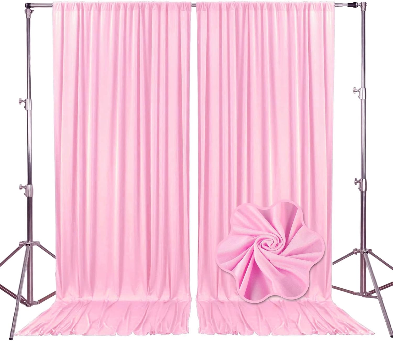 • 【Package Include】Each pack contains 2 panels of fabric shiny satin backdrop curtains. Each backdrop measures 10 feet x 10 feet (60 inches x 120 inches). There is a rod pocket designed on the top of the curtain, allowing you to easily hang it on a pipe or background stand. Tips: ONLY the backdrop curtains, no include a stand.