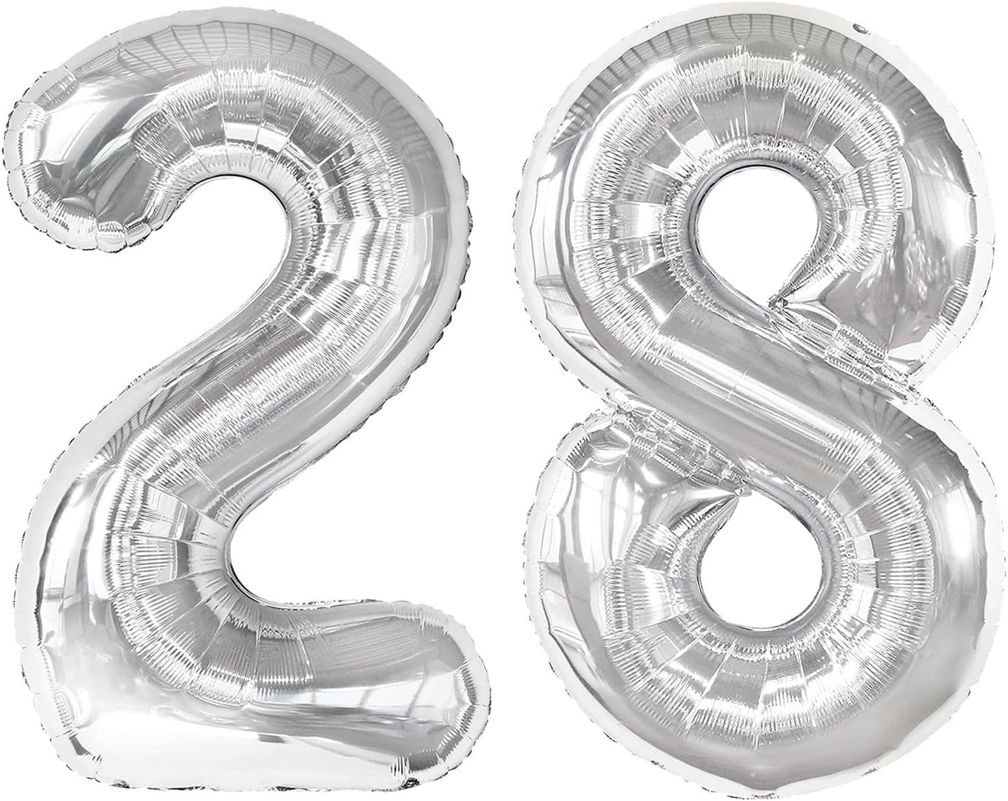 • 1.Elegant Understated Silver Number Balloons: You will receive an uninflated 40 inch number 28 balloon. Big number balloons are always the best statement of romance and surprise. Silver balloons symbolize vitality exoticism, adding glamour to birthday parties. Bright metallic silver and huge size make silver balloons a highlight of special parties. Choose one or more numbers from 0-9 birthday numbers, and use 28 balloon numbers to create a lively and charming party!