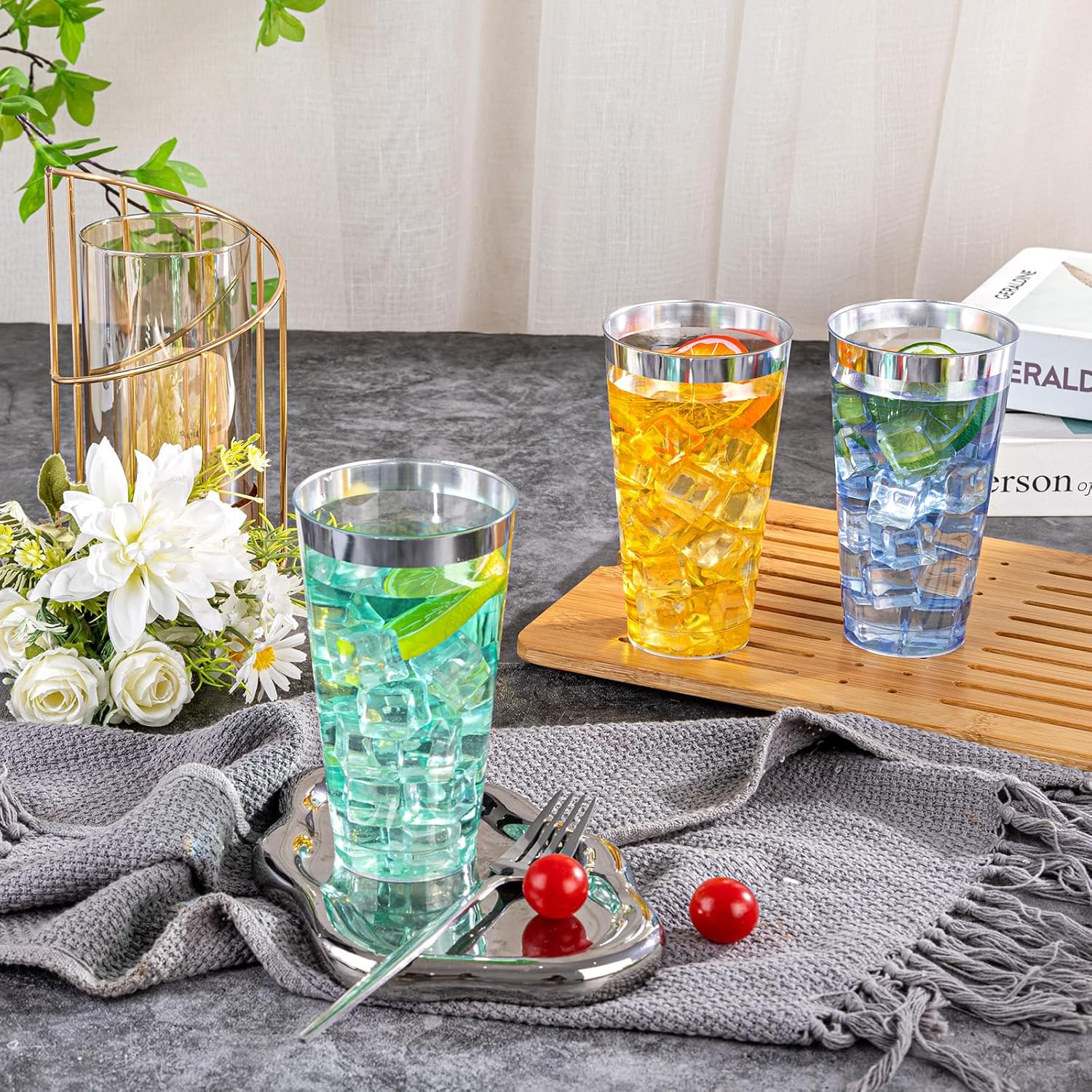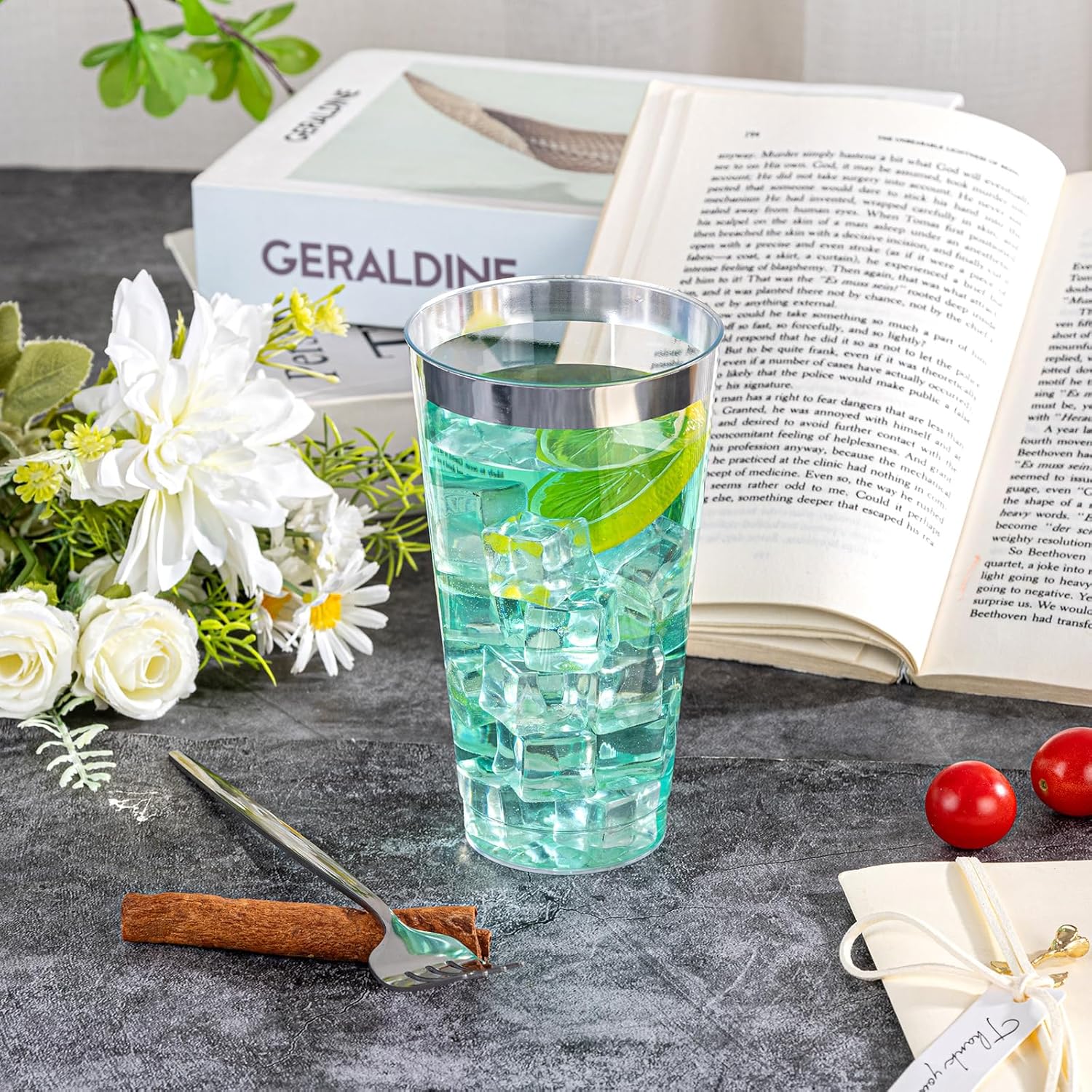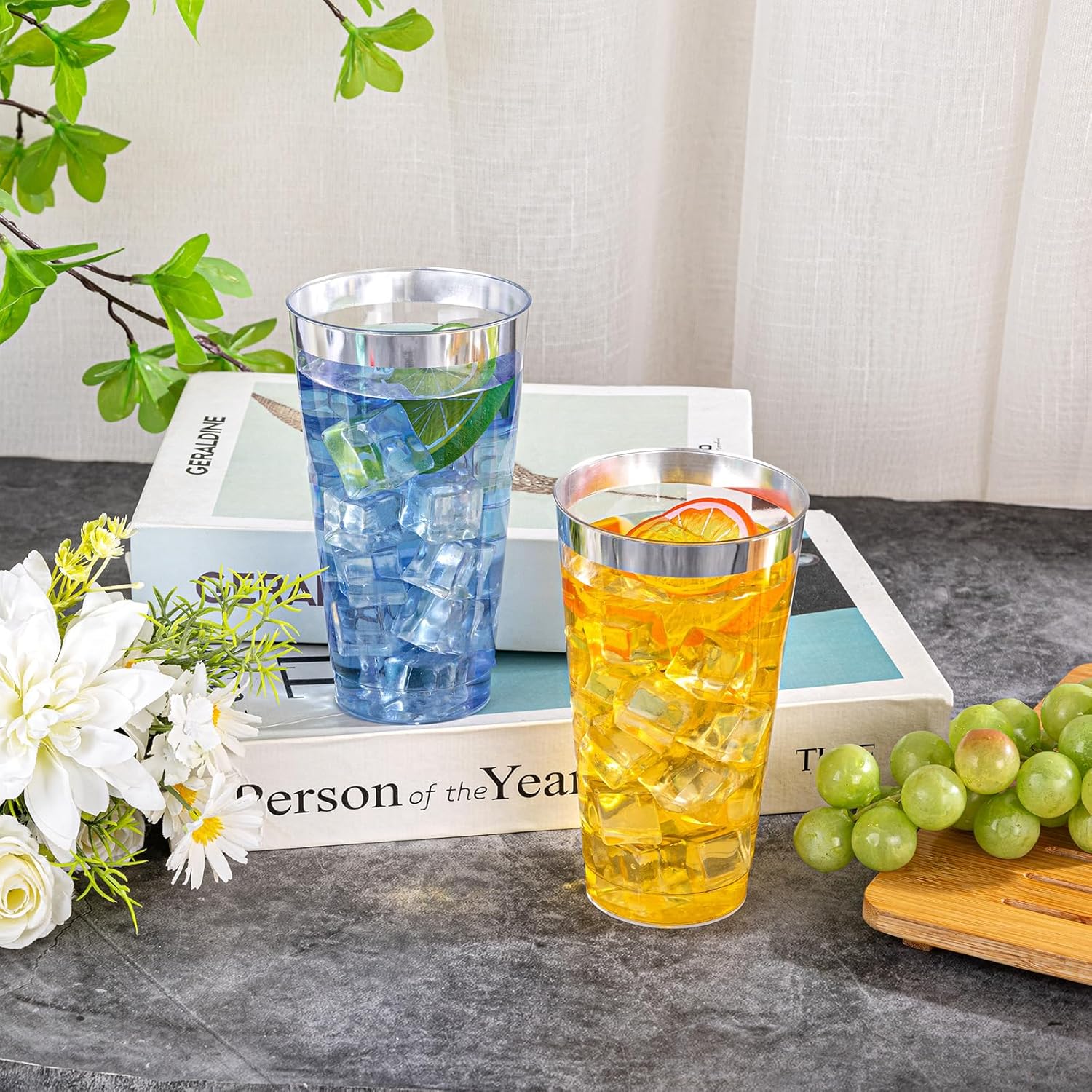 I00000 16 oz Silver Plastic Cups, 100 Pack Clear Plastic Cups,Silver Rimmed Disposable Cup, Heavy-duty Disposable Tumblers Perfect for Party, Holiday, Wedding & Birthday