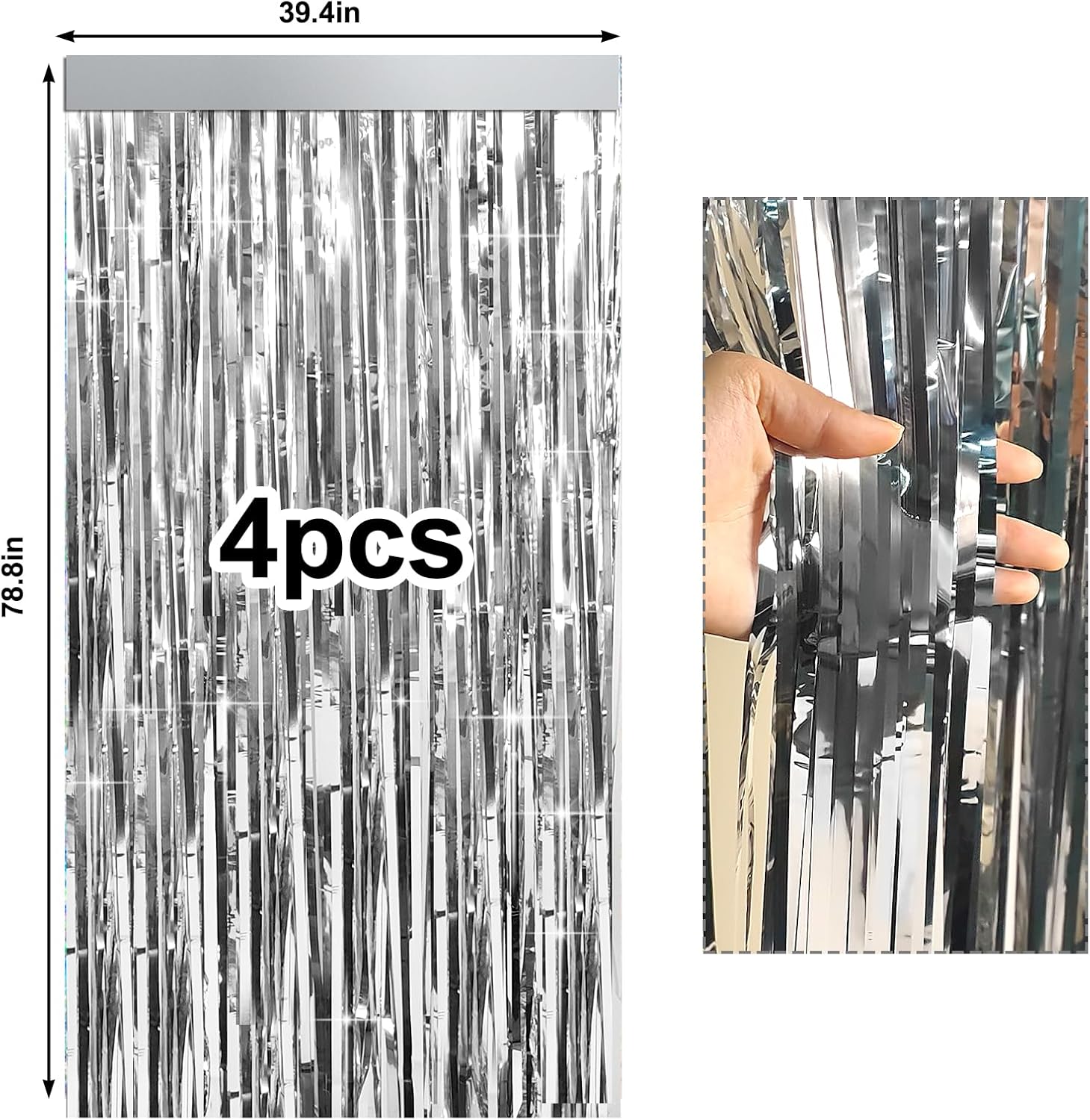 4 Packs Silver Foil Fringe Curtain, Silver Metallic Tinsel Backdrop for Birthday, Wedding, Baby Shower, Engagement, Bachelorette Party, Christmas Holiday Celebration Party Decorations Supplies