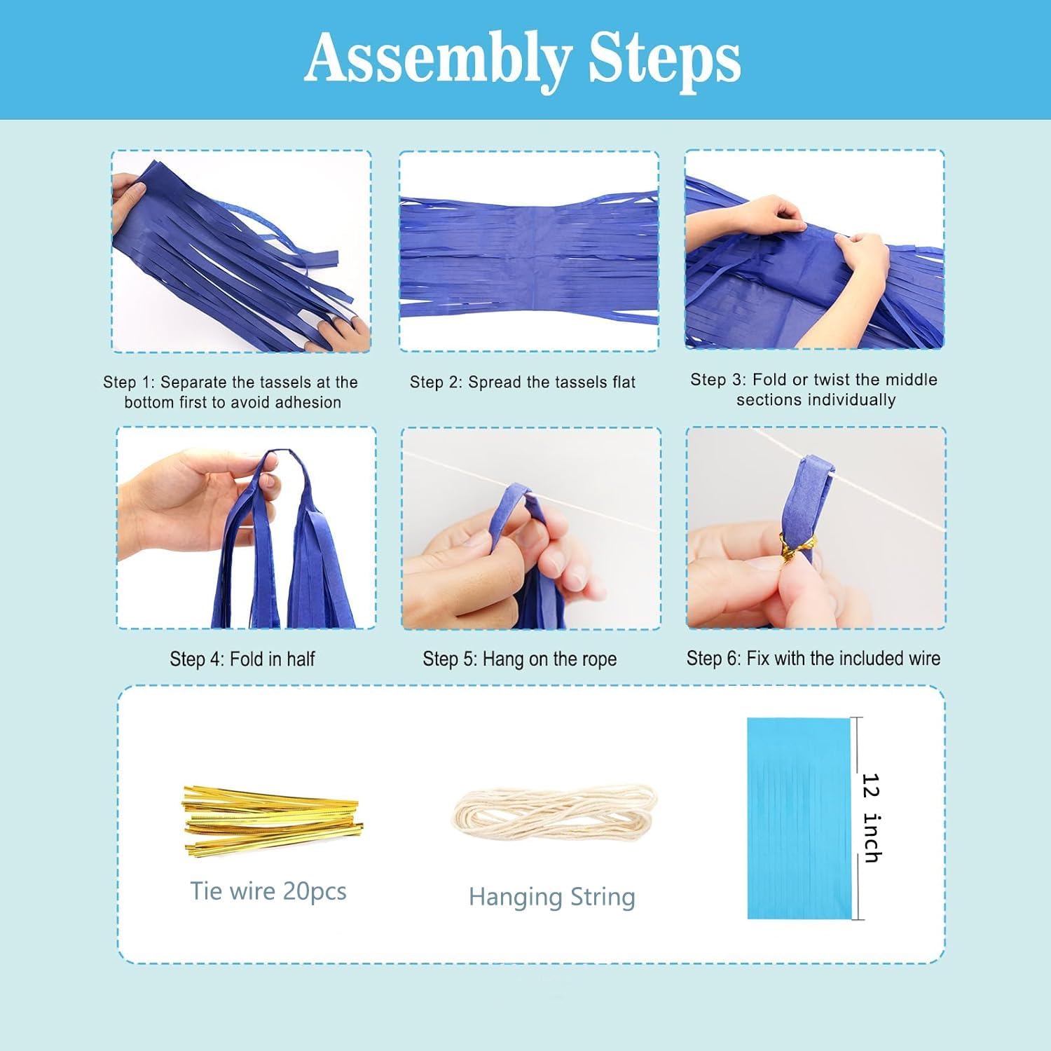 • Included: 20 tassels,one color 5 sheets,12inch long for each tissue tassles.It come with 20 tassels , a piece of jute twine and instruction.
