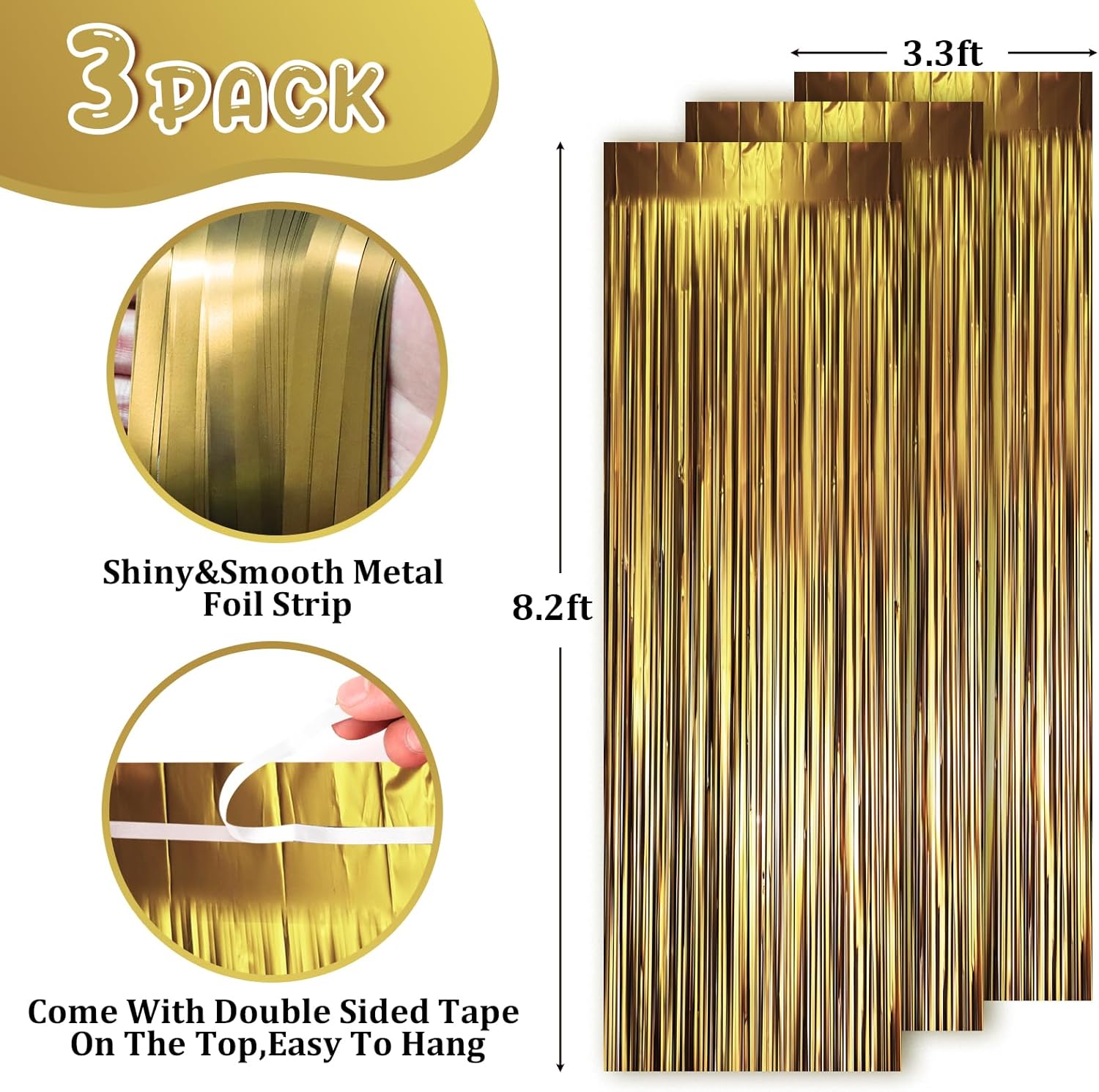 • Package Included: 3 packs of gold foil fringe curtains, the size of the foil curtain is 3.3*8.2ft. It's long enough to fit any occasion