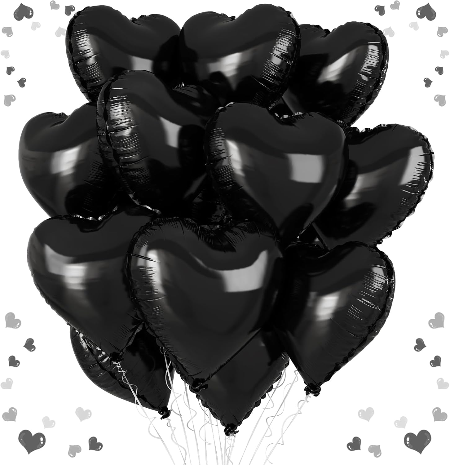 • Charming Black Heart Balloons: Elevate your celebration with our set of 12 heart-shaped black balloons, each measuring 18 inches. Accompanied by a ribbon, these balloons are ideal for creating a festive and loving atmosphere at any special event.