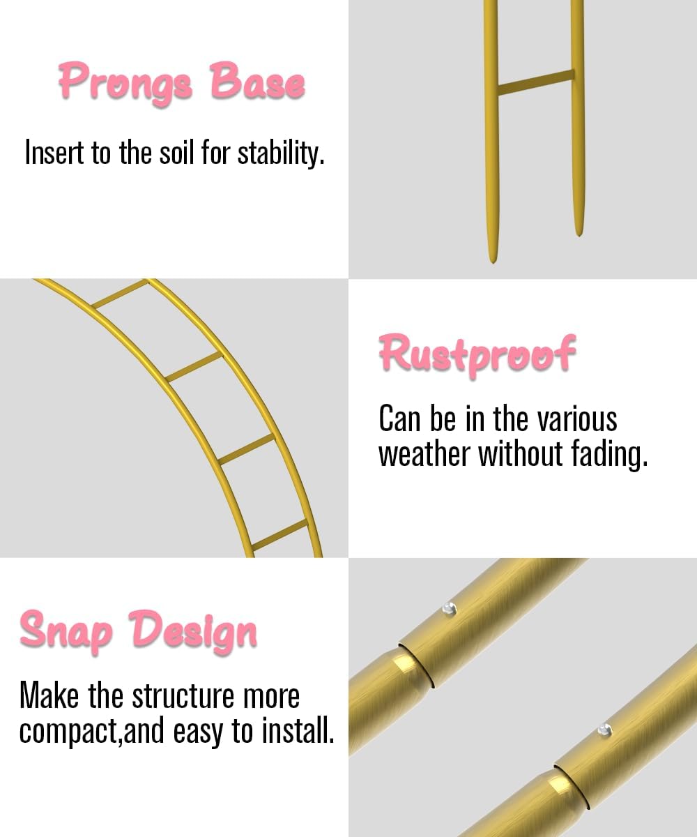 • Double-Tubes Construction: This garden arch features a robust double-tube structure with a sturdy base, ensuring exceptional stability and balance. The snap design contributes to a more compact and durable construction, making it suitable for both indoor and outdoor applications.