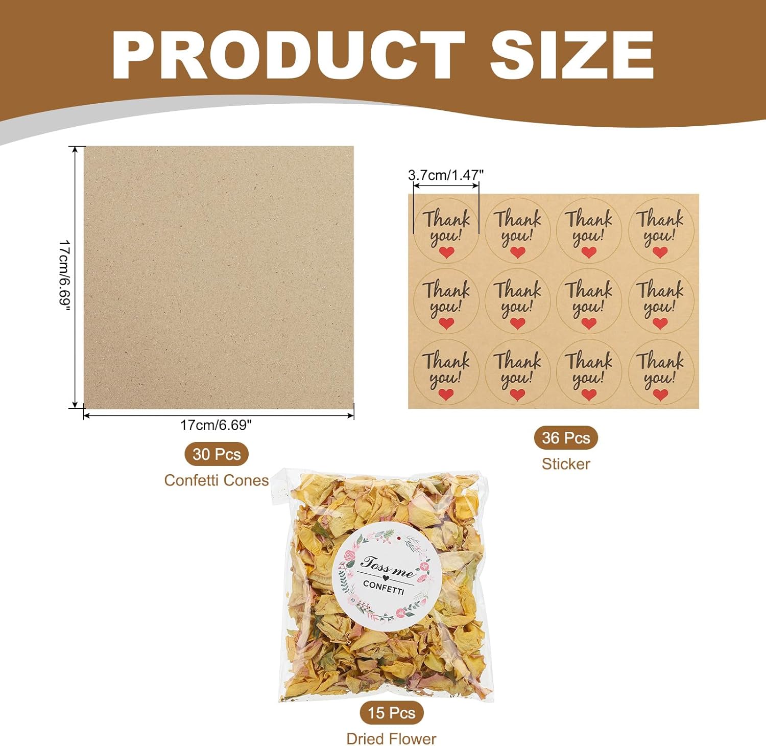 • Material: Paper; Color: Light Yellow/Pink; Paper Cone Size: 17 x 17 cm / 6.69 x 6.69 inch (LxW); Sticker Diameter: 3.7 cm / 1.47 inch; Dried Flower Weight: 160 g / 3.4 qt / 5.75 oz; Package List: 30 Pcs x Confetti Cones, 15 Pcs x Dried Flower, 36 Pcs x Sticker