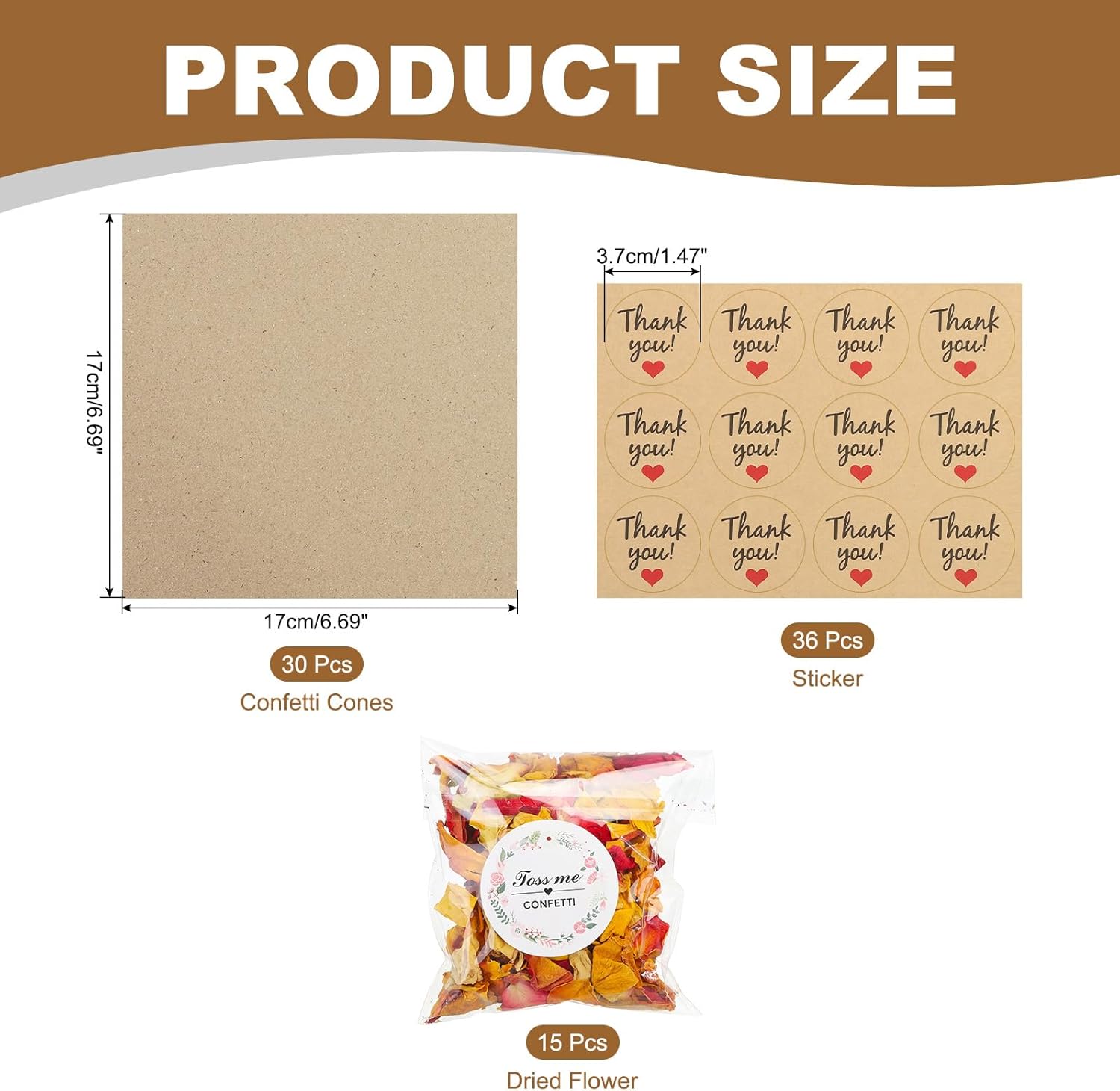 • Material: Paper; Color: Red/Yellow; Paper Cone Size: 17 x 17 cm / 6.69 x 6.69 inch (LxW); Sticker Diameter: 3.7 cm / 1.47 inch; Dried Flower Weight: 160 g / 3.4 qt / 5.75 oz; Package List: 30 Pcs x Confetti Cones, 15 Pcs x Dried Flower, 36 Pcs x Sticker