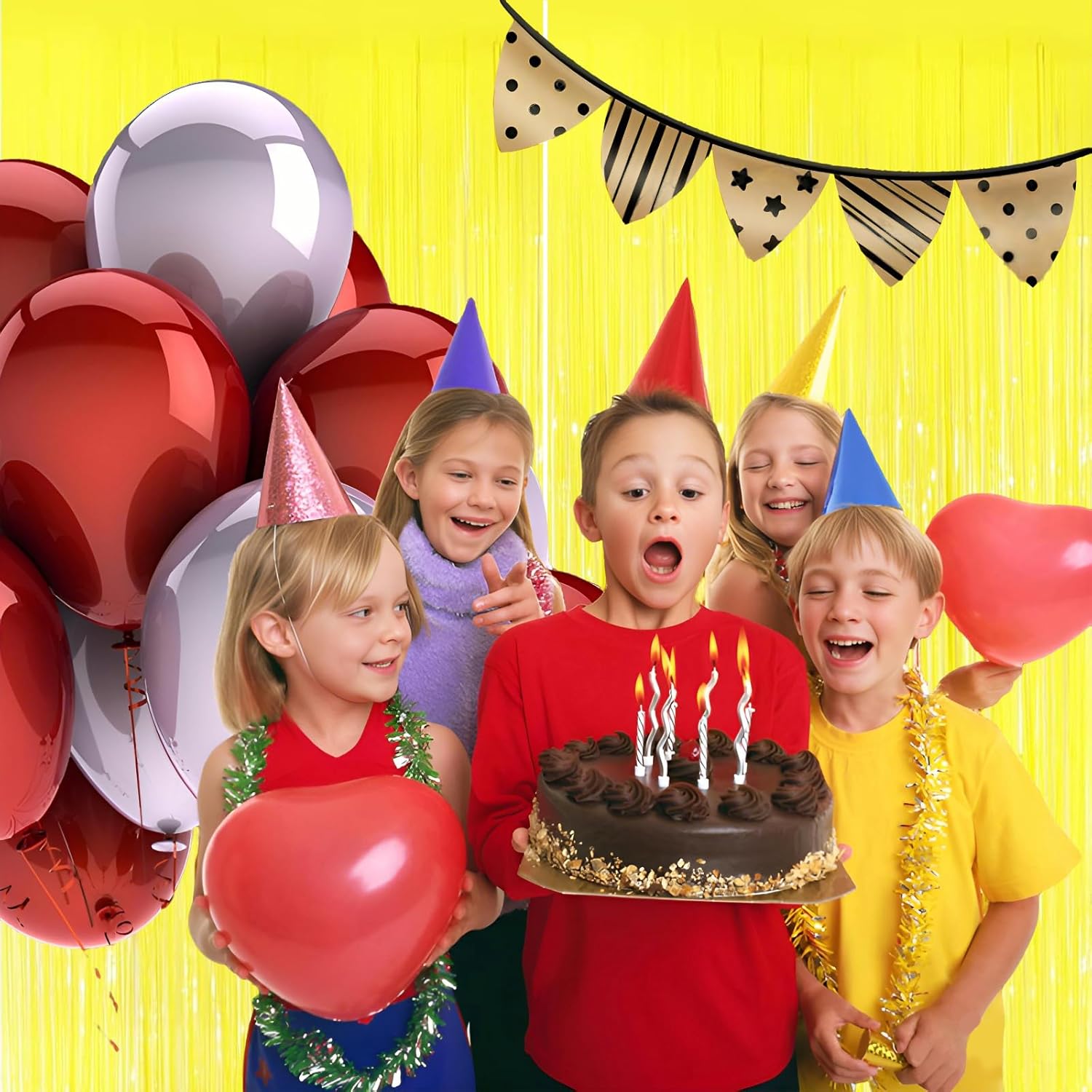 • Pair with other party decorations: Tinsel backdrop curtain can be paired with LED lights, balloons, banners, wreath, garlands, swirl streamer, tissue paper pom poms.