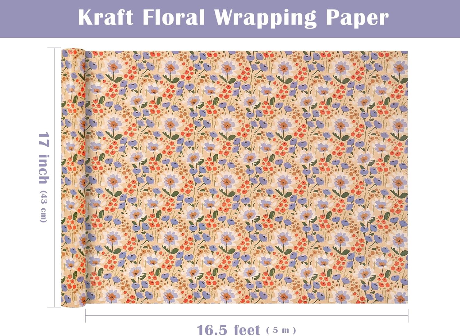 WRAPAHOLIC Kraft Floral Wrapping Paper Roll - Mini Roll - 17 Inch x 16.5 Feet - Watercolor Flower Wrapping Paper, Perfect for Wedding, Birthday, Bridal Shower, Tea Party