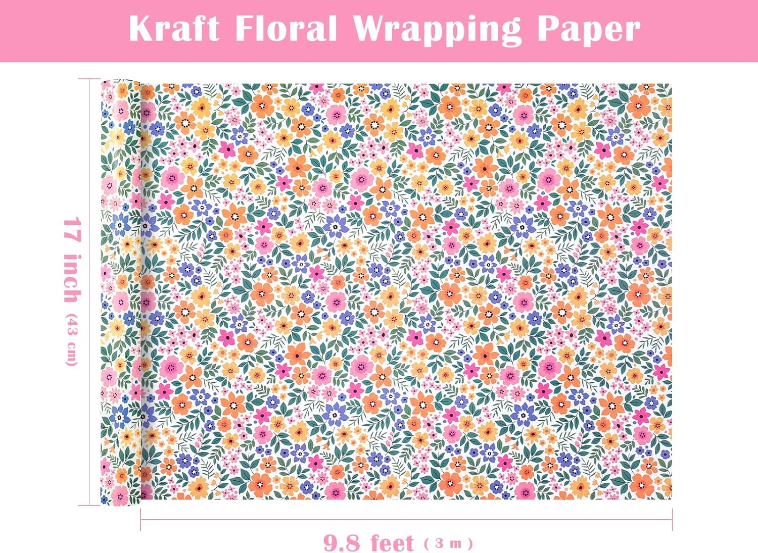 WRAPAHOLIC Kraft Floral Wrapping Paper Roll - Mini Roll - 17 Inch x 9.8 Feet - Ditsy Flower Wrapping Paper, Perfect for Wedding, Birthday, Bridal Shower, Tea Party