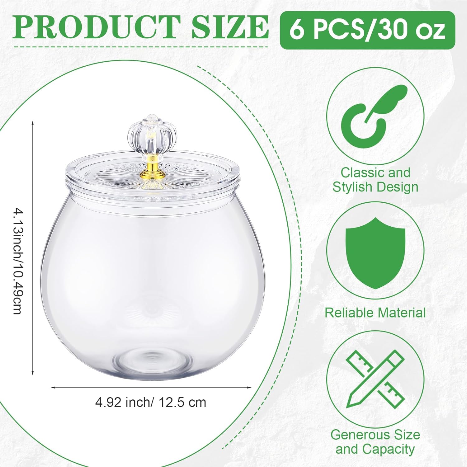 • Package Content: this pack includes 6 clear jars with lids; Each candy storage jar comes with a lid, making it ideal for those who frequently bake or entertain; The pack efficiently accommodates assorted goodies, enough quantity to meet your various requirements; Note: this product is made of plastic; Please confirm the material before purchasing