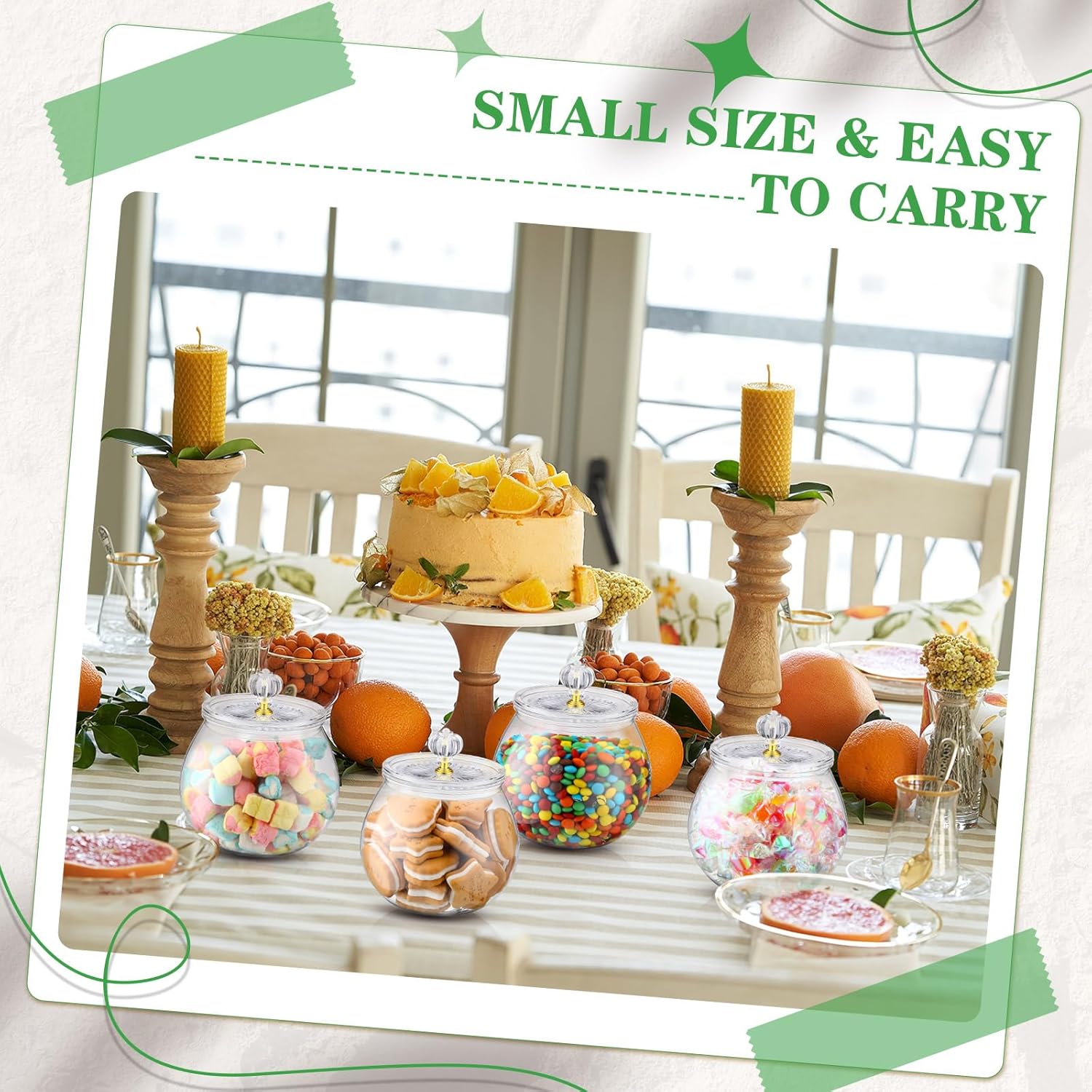 • Size and Capacity: the brilliant design of these plastic candy jars with lids boasts a size of about 4.92 x 4.13 inches/ 12.5 x 10.5 cm (excluding lid height); This space saving feature enables you to store up to 30 oz of your favorite sweets or snacks, fitting well on your kitchen counter or dining table