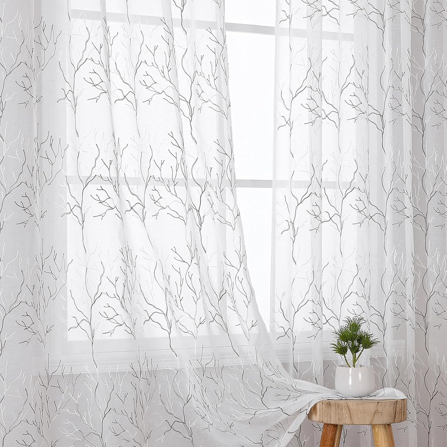 VISIONTEX Sheer Curtains 72 inch Length 2 Panels Set, Decorative Grey Coral Embroidery, Rod Pocket Embroidered Window Drapes for Living Room and Bedroom, 54" x 72"