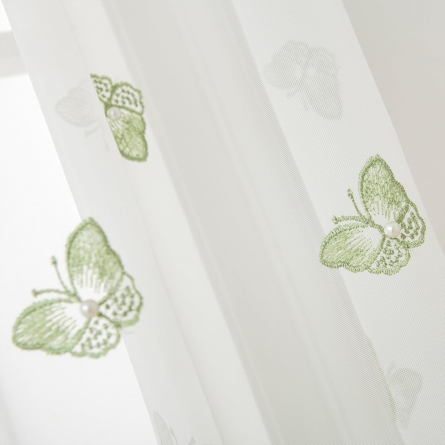VISIONTEX White Sheer Voile Curtains, Decorative Green Embossed Butterflies Rod Pocket Window Drapes for Home Kitchen, Living Room and Bedroom 54 x 72 Inch, Set of 2 Curtain Panels