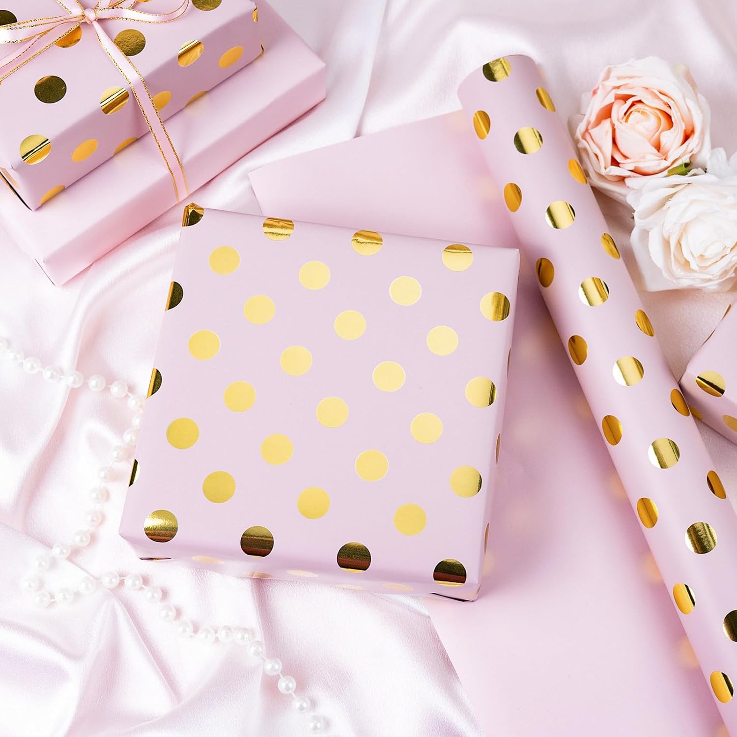 • Double-Sided Wrapping Paper: One side has pink and gold polka dots, and the other is solid pink, making your gift wrap both fun and elegant