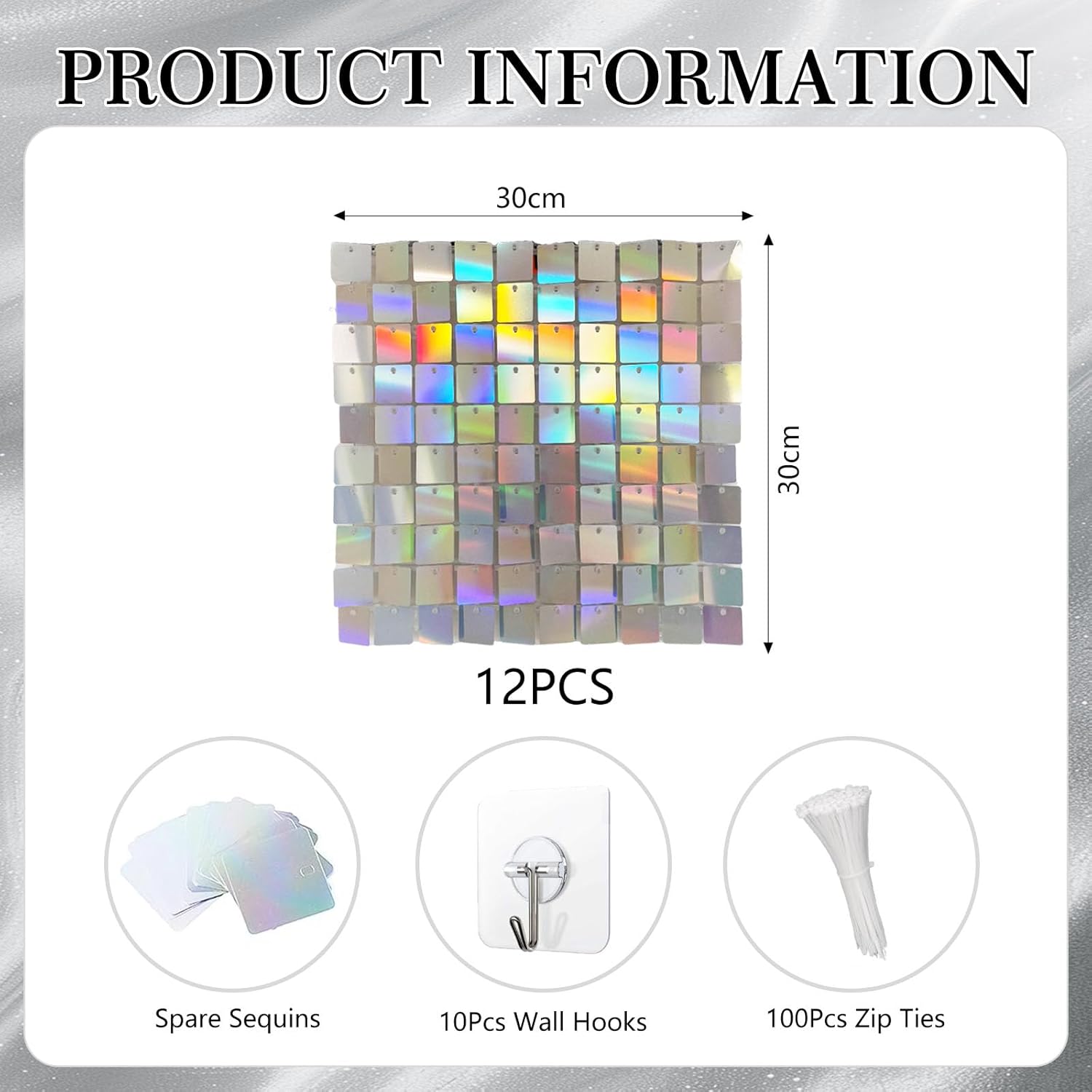 • 【Package Includes】Each box includes 12 colorful sequin wall panels (12"x 12" each). We provide enough zip ties (100 pcs), a pack of spare sequins, and wall hooks (10 pcs) to support the weight of the wind panel, as well as an installation manual. 12pcs can cover 3x4ft place. More boxs will cover a larger area and have a fuller look.